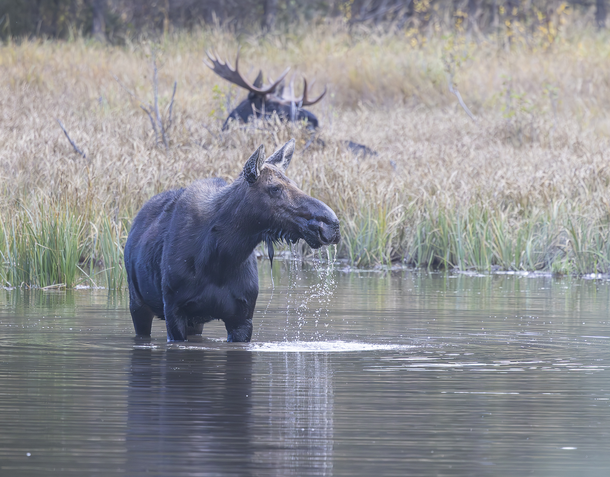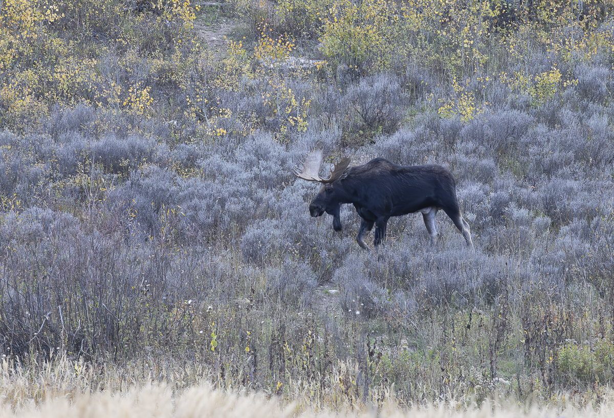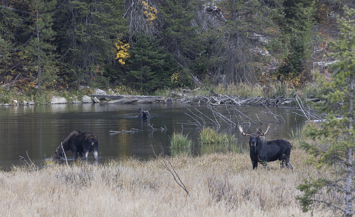 A couple of weeks ago we went on our annual truck camping road trip during our birthdays week (our birthdays are a week apart). Our first stop was Grand Teton National Park. Melissa shared some of the incredible fall colors of that area in our last post. One of my goals on this trip was to see a moose, hopefully a nice bull. I think the moose population in Yellowstone is increasing but this year we have had little luck seeing these magnificent creatures on our outings in the park. The Tetons are well-known for the larger numbers of moose so I was hopeful. On our first day we drove down the road toward the Gros Ventre campground, a road we had seen a nice bull moose on earlier this summer. And, in almost the same location as our earlier sighting, there was a bull moose. He was bedded down in thick vegetation along the river so not a great photo op, but at least we saw one. After driving around to various locations the next day, we decided to take a hike to a pond where Melissa and her sister had seen a moose a few weeks earlier. It was late afternoon and as we walked, an elderly couple (can I still say that?) approached from the direction of the pond. I asked if they had seen any moose. “No, but someone said a few have been seen up another trail and have been there all day”. I was bummed, but we continued on. A few minutes later we encountered three young men coming out. They immediately said there were 3 moose at the pond and cautioned us to be careful as one was a large bull. We laughed and wondered how two reports just minutes apart could be so different. As we approached the ponds, we saw a few folks gathered on the other side of the far one and then we saw them – two moose! A cow out in the water and a large bull on shore.