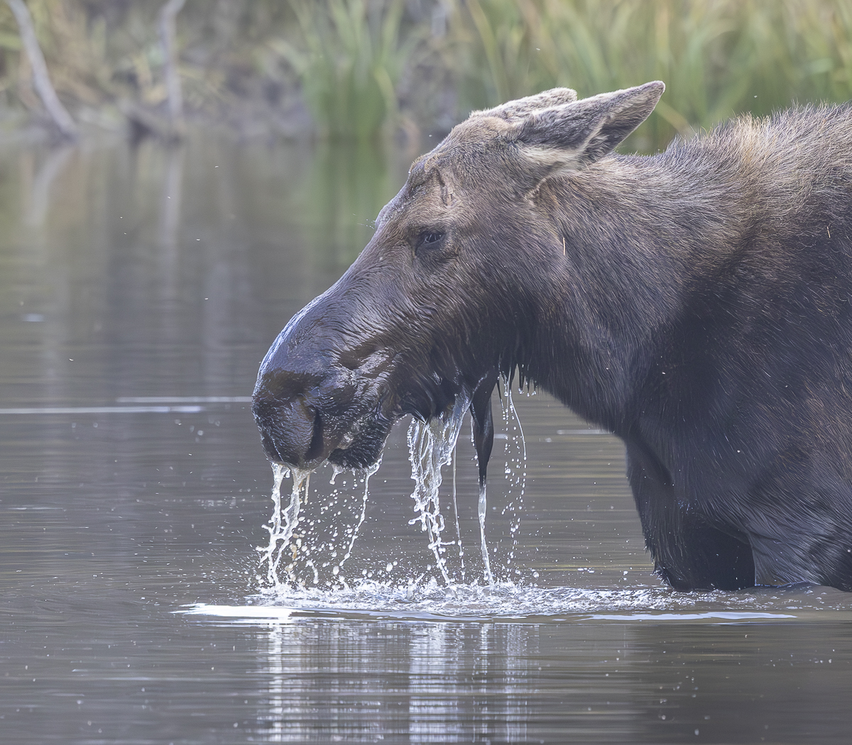 –We spent a long time quietly watching the cow moose feed on aquatic vegetation