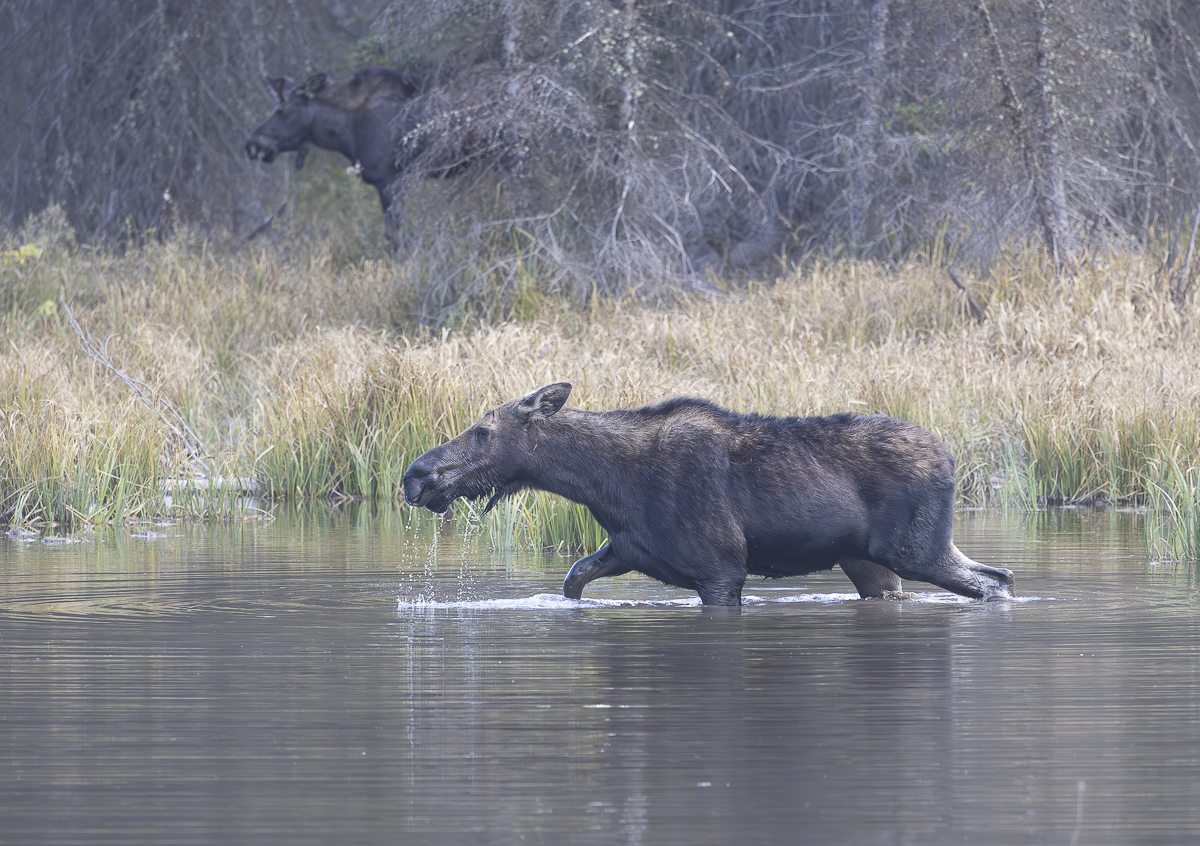 We walked over to join the rest of the people and settled in to quietly watch the cow feed on submerged vegetation while the big bull looked on. This was the start of the rut for moose so this big fella was undoubtedly guarding her in order to mate. The young bull was either an offspring of the cow from the previous year or a young guy hoping to get lucky.