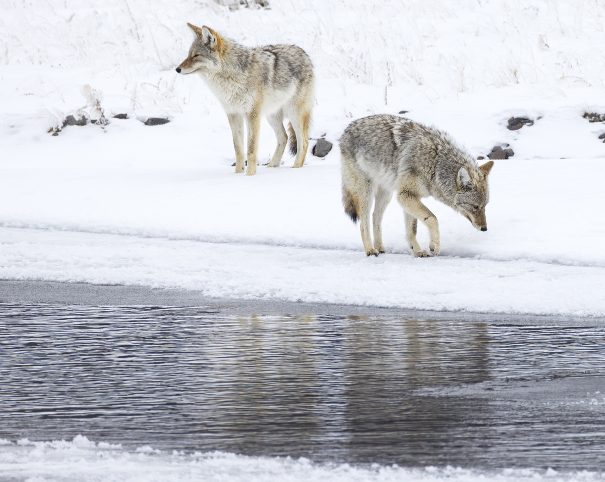 The next evening as I was driving through the Blacktail Ponds region, four coyotes were making their way between the frozen ponds. One stopped at a small hole in the ice that has puzzled us for some time now. What causes this hole, a small thermal underneath perhaps?