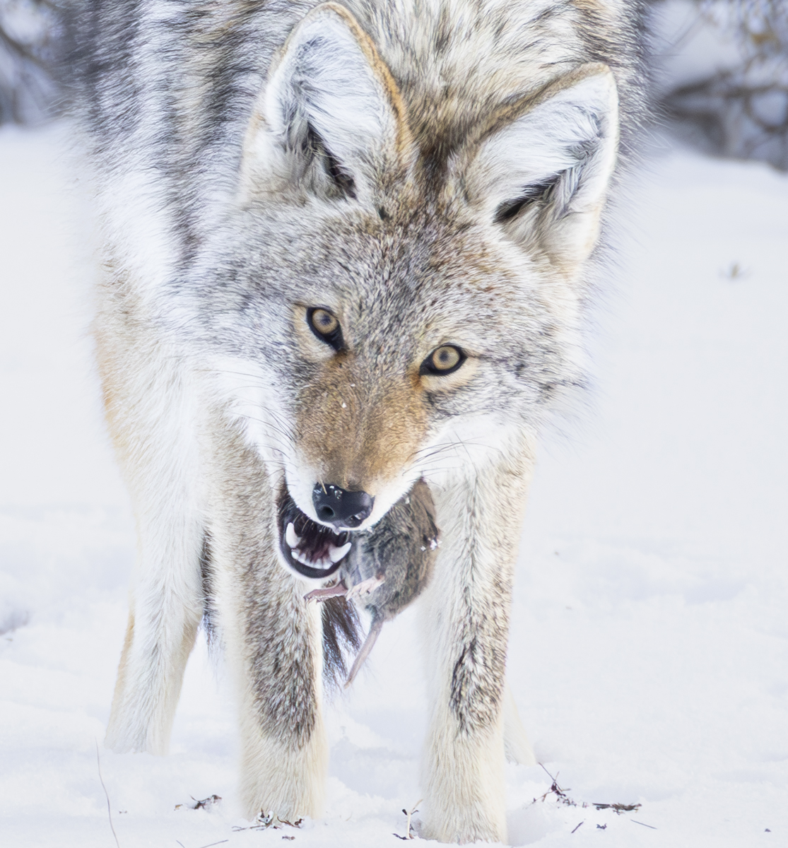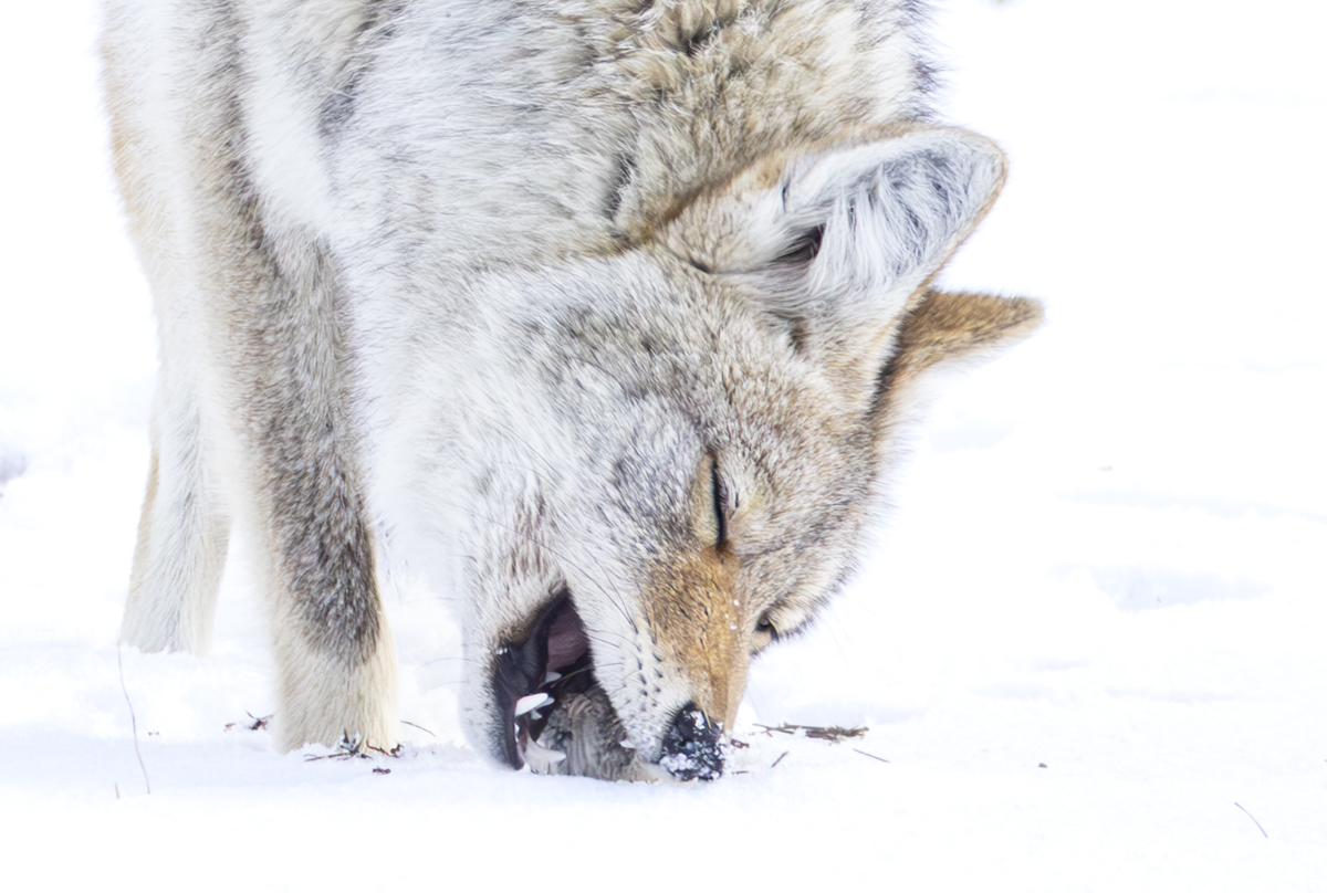 A coyote standing over a rodent carcass
