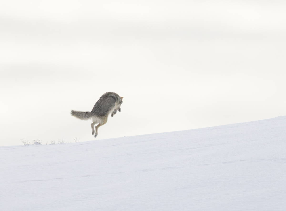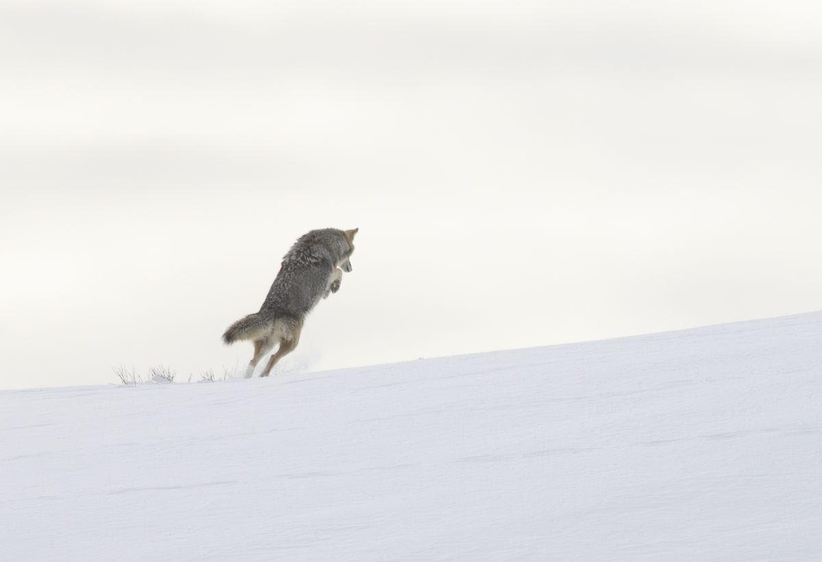 This is the classic mousing jump of coyotes and foxes, especially in winter. This one did make a catch and quickly gobbled its rodent meal as it disappeared over the ridge.