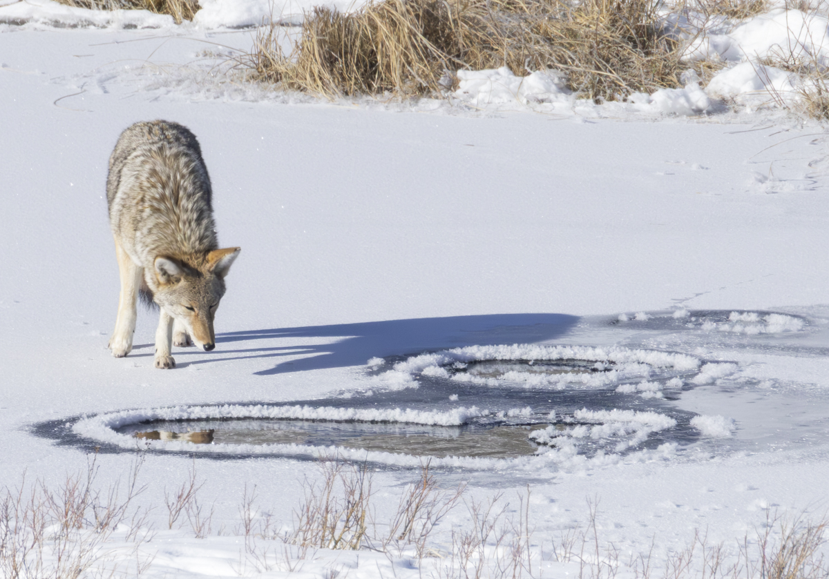 A coyote checking out the hole in the ice (or perhaps just admiring his reflection).