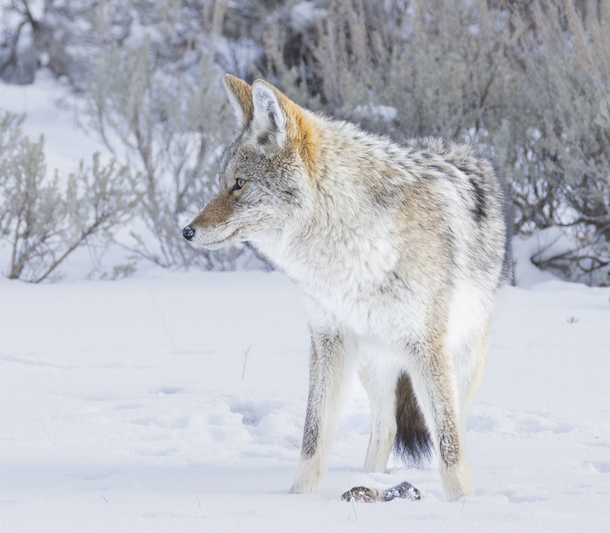 The next day I was back out on the northern range hoping to see more wildlife. It was cold with temperatures hovering just above zero. Though it was a somewhat slow day overall for critters, the coyotes did not disappoint. As I was headed home I saw a few cars stopped at a pullout in Little America. I soon spotted the reason – a coyote trotting along slowly near the road. I drove on with the intent of turning back and trying to find a place to park when I saw another coyote about 200 yard down the road from the first, and there was no one watching this one. I pulled off the road and watched from my car. It stopped and stood over a spot sniffing the snow. It then dug up a small carcass. I have no idea if this was something it had cached earlier or just found dead in the snow.