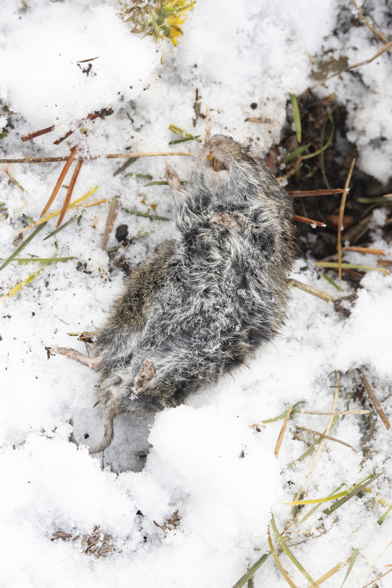 Voles are active year round and have tunnels beneath the snow (the subnivean zone) where they travel and feed. This year’s unusually shallow snow depths probably puts them at a disadvantage both in terns of risk from predators and extremes of temperature (the normal snow depth has an insulating effect and their subnivean habitat is maintained at a relatively constant 32 degrees). We reburied the vole in the same spot and drove home. The next day we drove back and decided to check and see if the fox had returned for its prize. I have been curious as to how long they might leave a cache and if they generally find all of them. After a little searching we found the vole still buried. I had to wonder if our scent might deter the fox from returning or did it just not come back. We’ll never know.