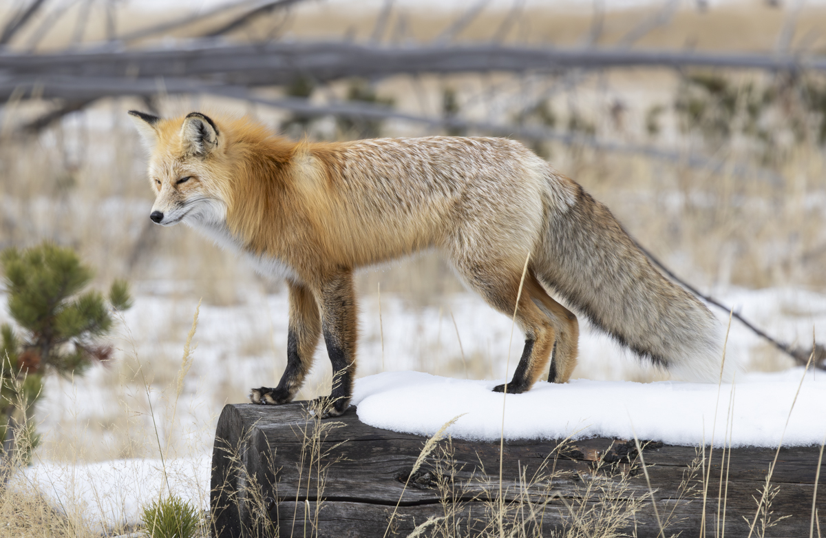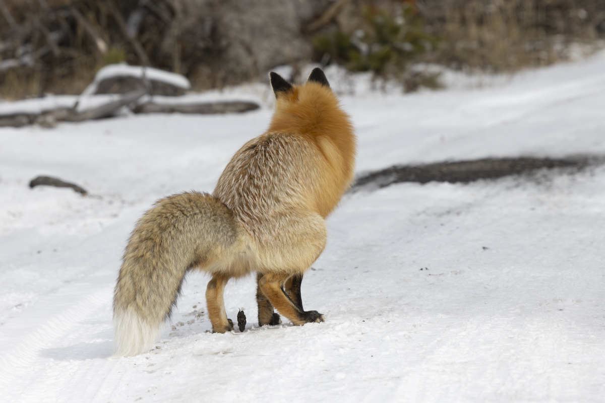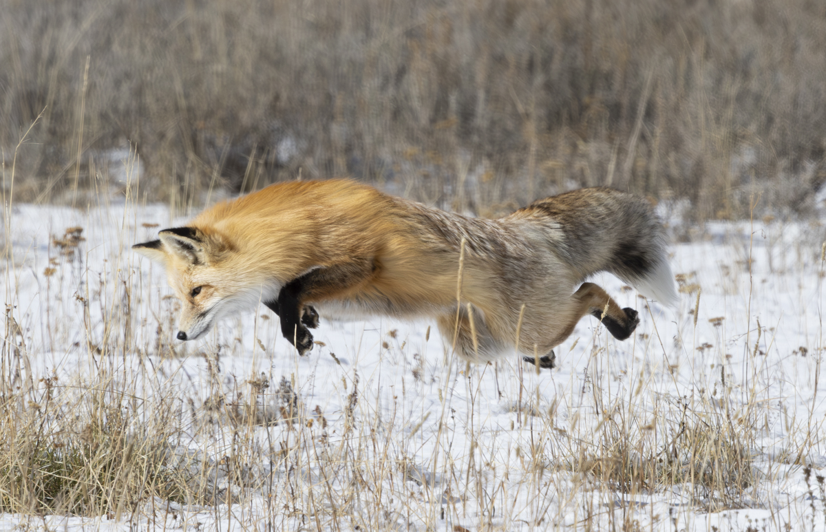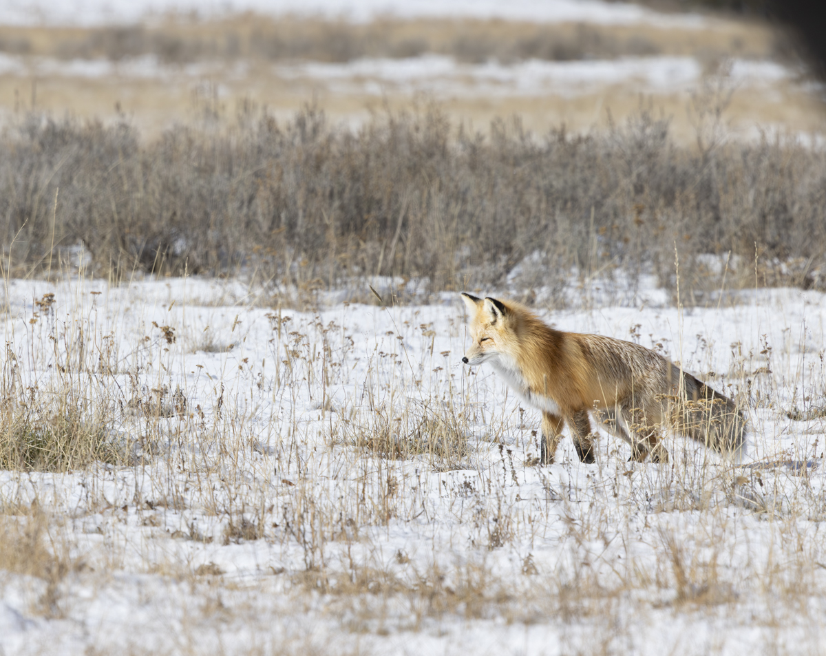 As we were driving near Mud Volcano, we spotted a red fox out in the sage and grasses of a roadside meadow. It was slowly going along listening and hunting. There was only about 2 to 3 inches of snow on the ground so no classic head dive jumps were in order, but we pulled over to watch anyway.