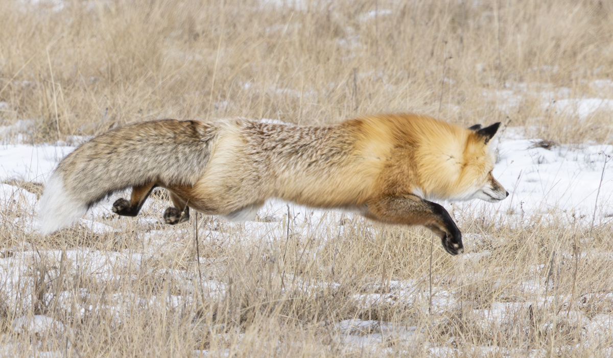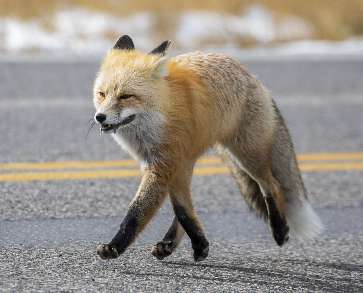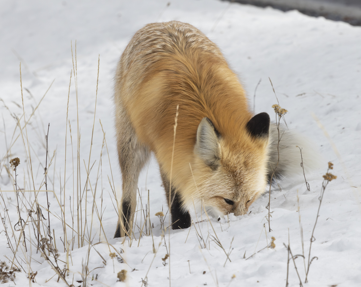 As we were driving near Mud Volcano, we spotted a red fox out in the sage and grasses of a roadside meadow. It was slowly going along listening and hunting. There was only about 2 to 3 inches of snow on the ground so no classic head dive jumps were in order, but we pulled over to watch anyway.