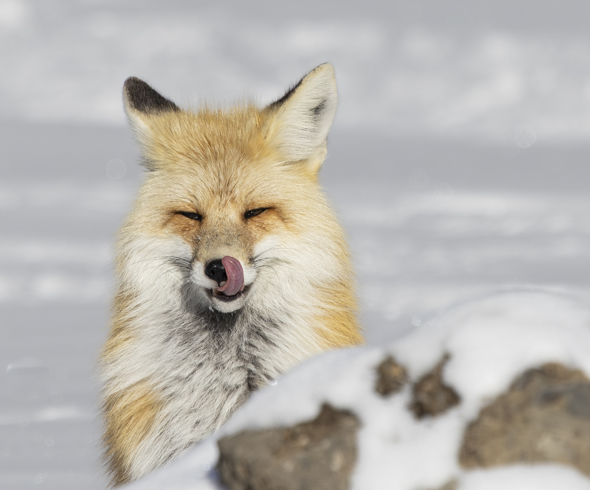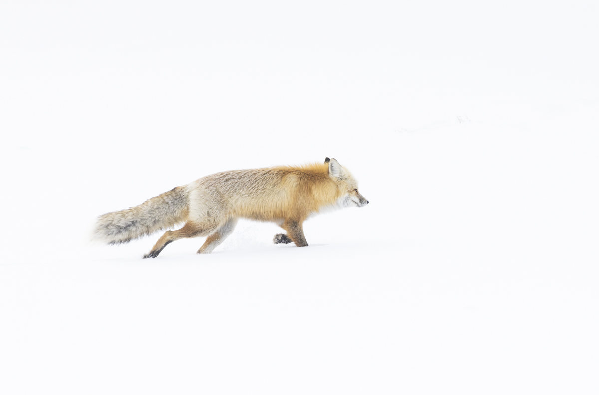 On a January trip into the interior via snow coach our group spotted a red fox in Hayden Valley. The first glance was of it doing an impressive leap and head-first dive into the snow after a rodent (most in our coach saw it but I was in the back and missed that). We stopped and got out and watched as the fox continued on in a sea of snow, its fluid form jumping off the white canvas. This is the essence of the fox, a delicate ghost that adds a splash of color and mystery to a beautiful winter scene.