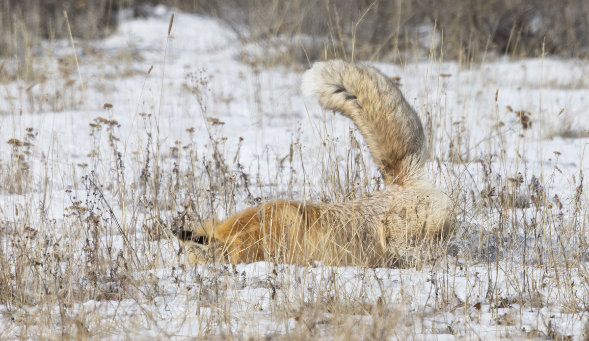 Then it did something that we felt privileged to witness…it cached this prize in the shallow snow right next to road about 25 yards from us. After dropping the rodent, the fox stuck its nose in the snow in a couple of places and then pushed snow aside, picked up the prey and dropped it in place. It then pushed snow over it with its nose and trotted off down the road.