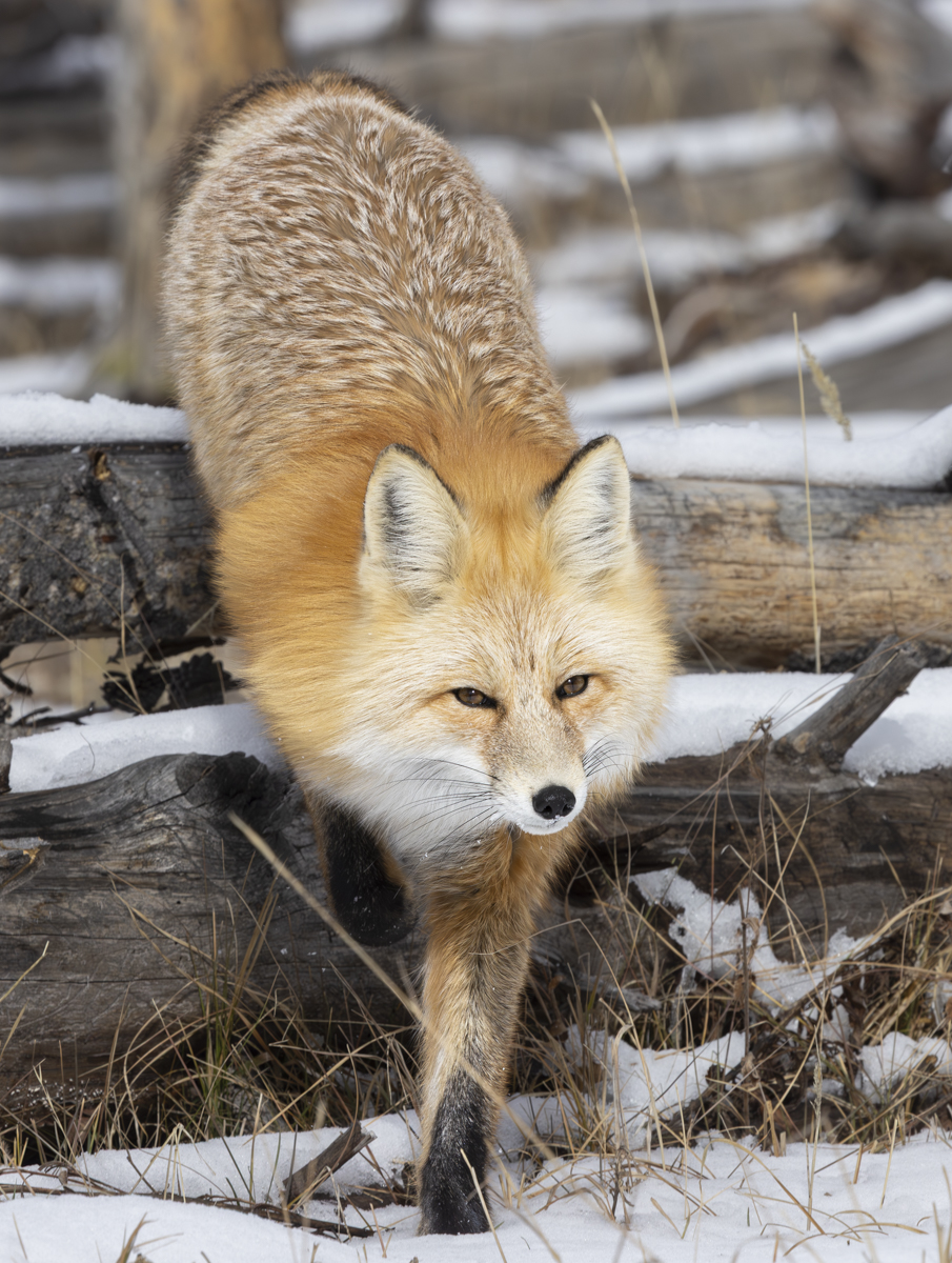 One of my favorite animal species to see in winter is the red fox. They are masters of mousing and I have a goal of getting some good photos or videos of one doing that in deep snow. But this winter is not cooperating as we are way below normal snow levels in much of the park. We did have an early snow back at the end of October and we took a road trip down to Hayden Valley right before the roads to the interior closed for the winter season (typically the first of November through some time in April depending on snow levels). Visitation is down that time of year but there were some die-hard wildlife watchers in pursuit of great gray owls and ermine that had been seen in recent days in that region. We also looked for great grays and got lucky the next evening as I posted back in November.