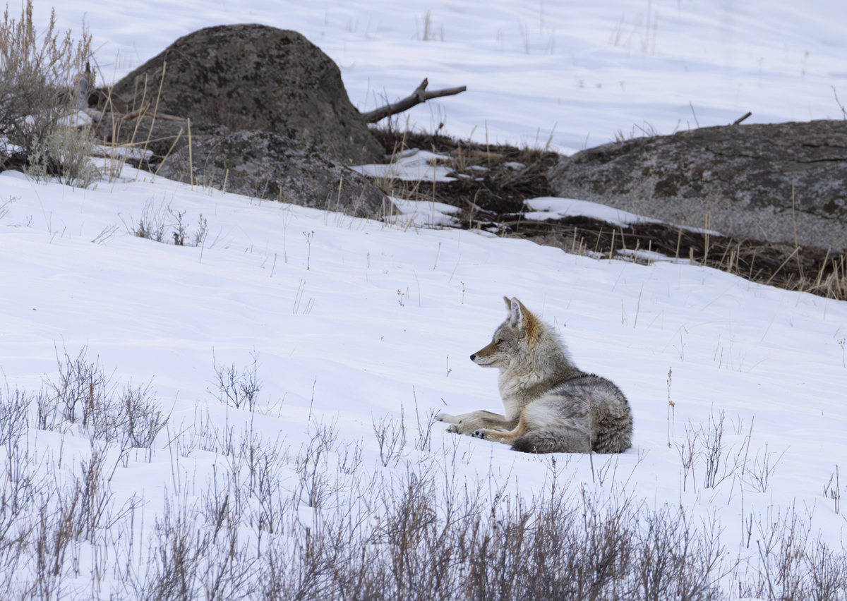 I left the fox and continued homeward passing through a few bison jams on the way. Near Junction Butte I spotted a woman off in the woods with her phone pointed up the hill. I pulled over and went back as she was headed to her car. That is when I saw the object of her photos – a coyote laying in the snow. The woman drove off leaving me and the coyote alone.