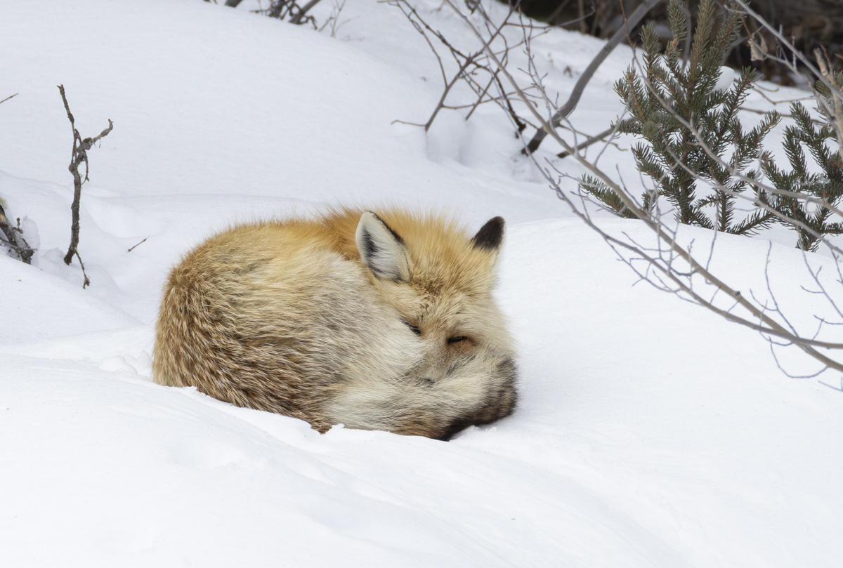 –Red fox about to take a snooze in the snow