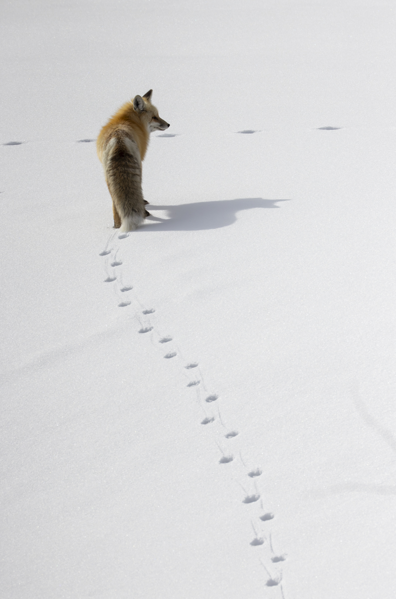 Standing up on the road looking down at the fox and his track trail. Notice the foot drag mark in the snow as the fox pulls each paw out of the snow going forward.