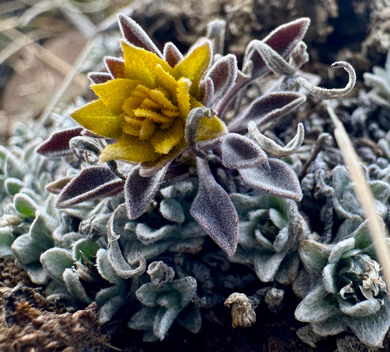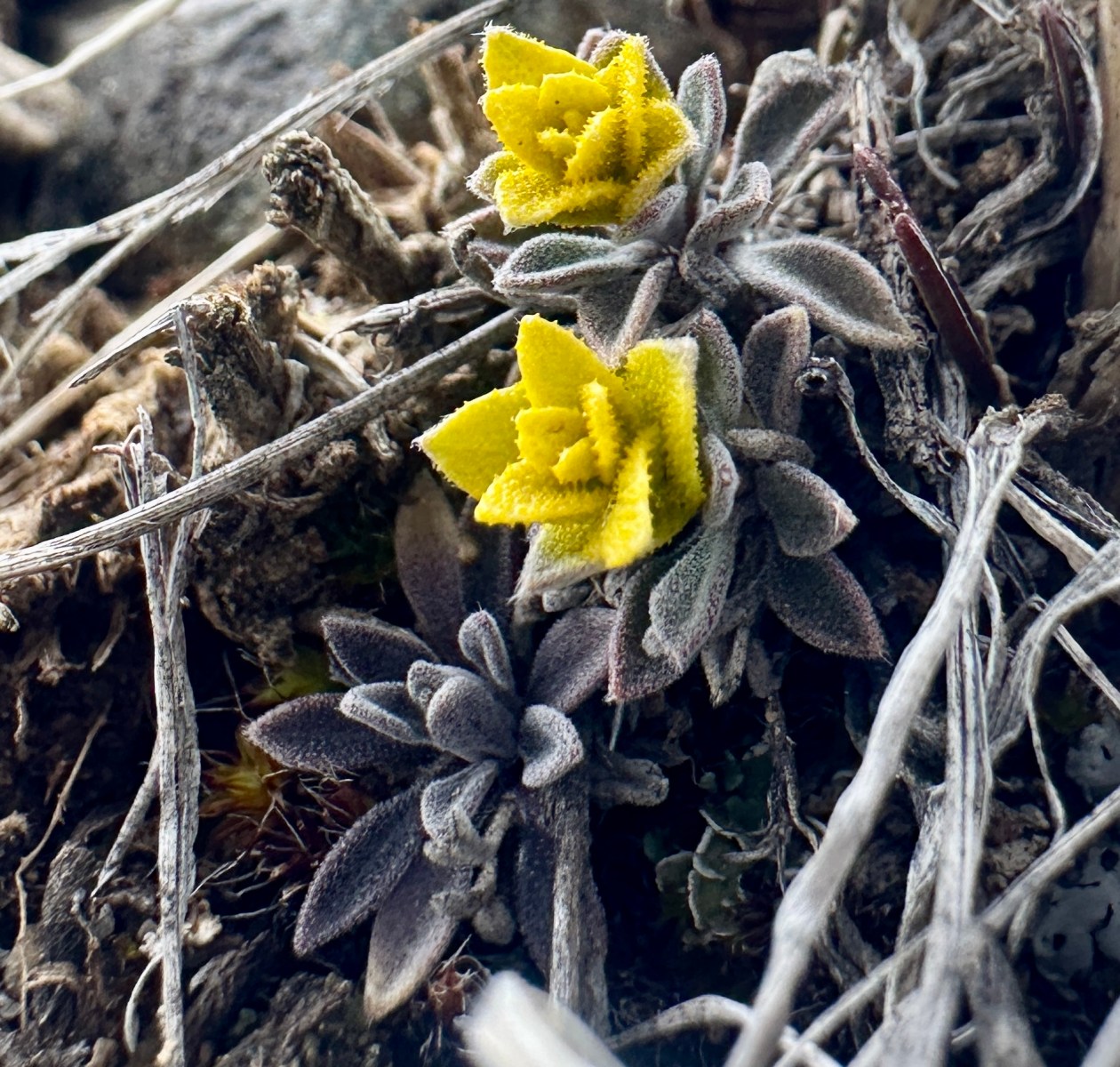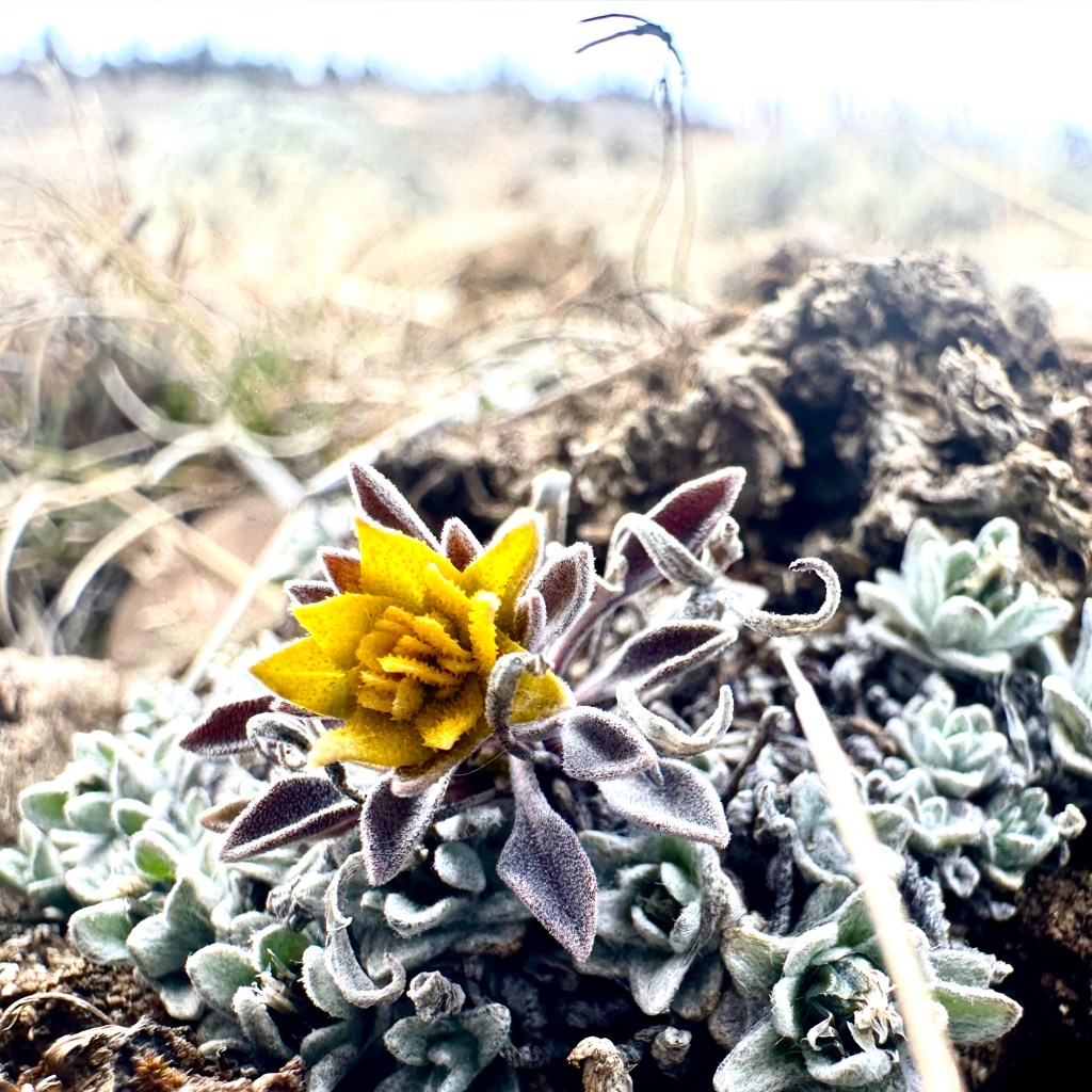 When I spotted a yellow flower hugging the ground near the rock I was sitting on, I was excited! It reminded me of the yellow stonecrop (lanceleaf stonecrop) that is abundant around here. In the summer, we had seen a Rocky Mountain parnassian butterfly laying eggs on and near stonecrop plants out in the park. I immediately thought of those butterfly eggs and wondered if they’d be hatching soon to munch on the spring stonecrop growth.