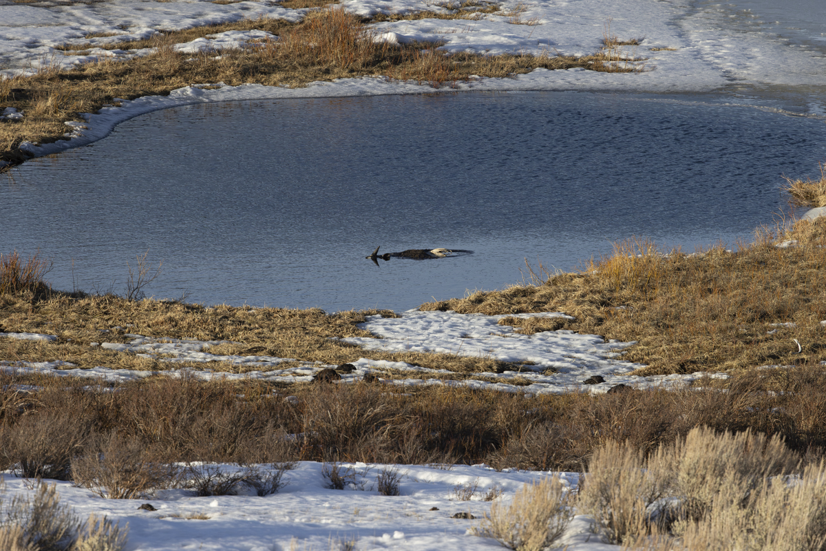 Every winter, one or more bison drown in the Blacktail Ponds area when they break through the ice. If the carcass is away from the shore, eagles and ravens can land on it and try to feed but the hide is so tough that it takes things with teeth (like coyotes, wolves, bears) to break through. The carcass shown below has been floating in this small pool for some time now and I have seen coyotes looking longingly at it from the bank but I haven’t seen any on it (though eagles and ravens have landed on it and the ribs are exposed so maybe something has been able to pull away at some of the meat).