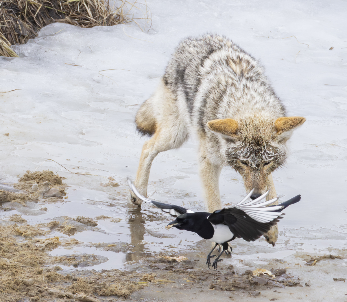 A black-billed magpie flies off with a morsel in its beak as the coyote gets close