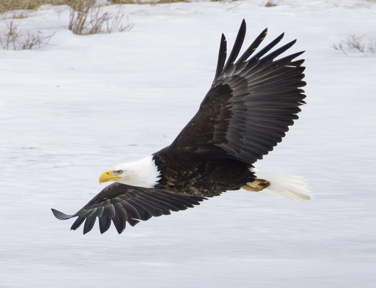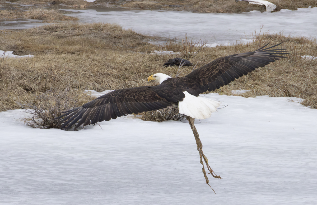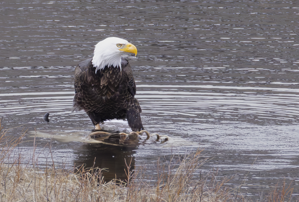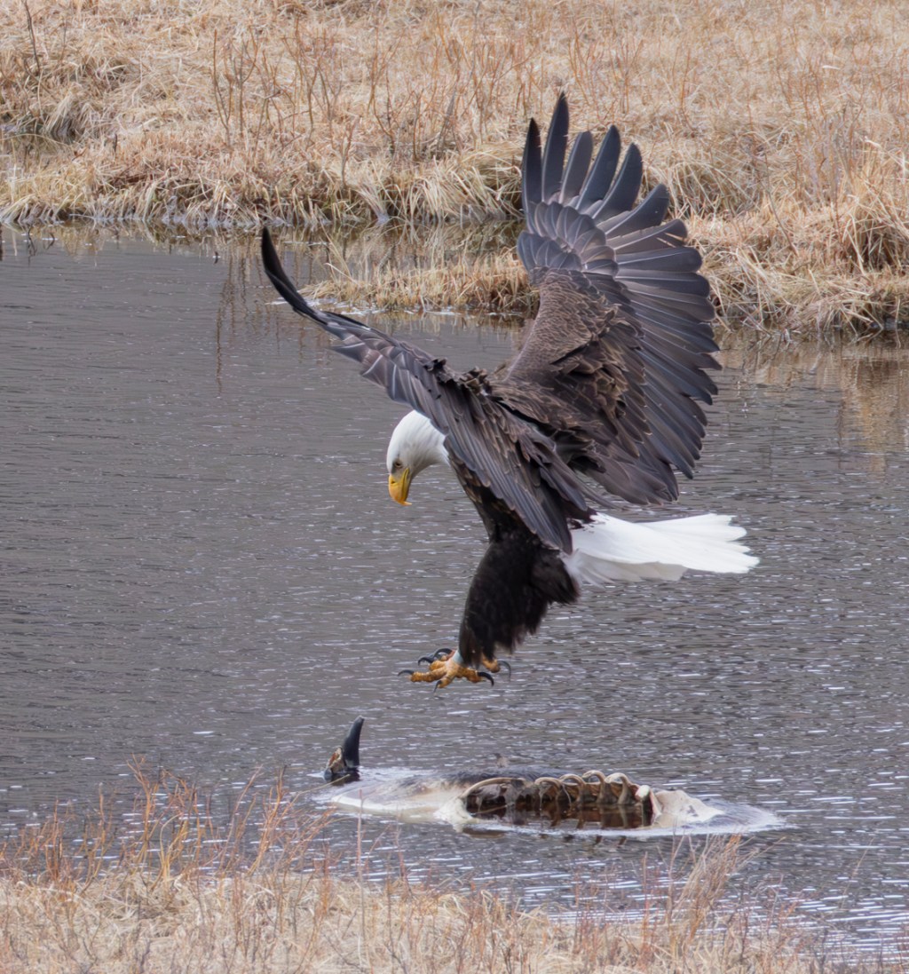 I finally headed home with the second eagle still on the carcass and its mate watching, perhaps knowing they would both need to wait for an awakening grizzly to come and pull the bison out of the water before they would get much else from this carcass.