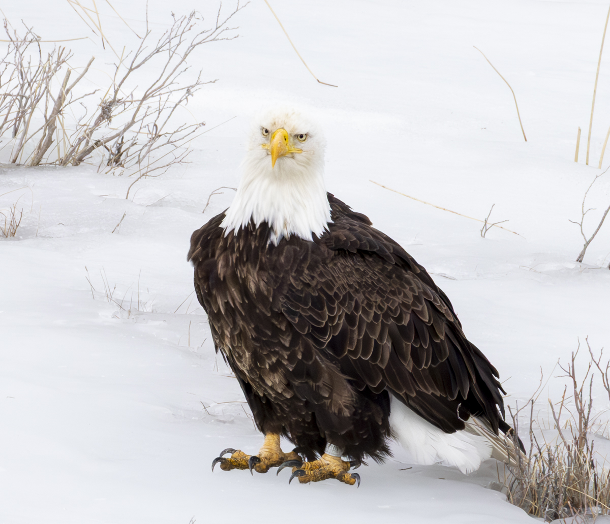 A bald eagle staring at the carcass area (note the leg band)