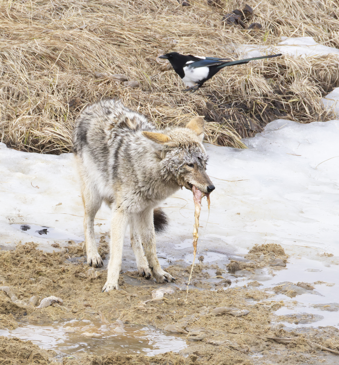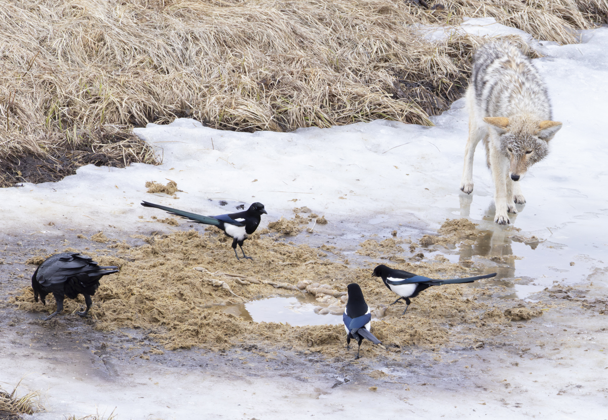 This next clip is not for the squeamish I suppose. It shows the coyote pulling out some more of the internal organs of a carcass as magpies and a raven continue to pick at the leftovers. Notice the circular patch of dried “grass” that surrounds this small water hole. That is probably the contents of the deceased animals’ rumen (one of the four chambers of the stomach of grazers like bison – ruminants). Melissa and I discussed the oddity of the distance of this pile of “goodies” so far from the floating carcass. Did something manage to get the organs out of the carcass and carry it here? Or is this from another bison carcass that is submerged beneath the ice layer but that has this hole that gives critters access? However it happened, this coyote was doing a bunch of head dunks to pull out whatever it could to eat as other scavengers looked on (and grabbed some for themselves).