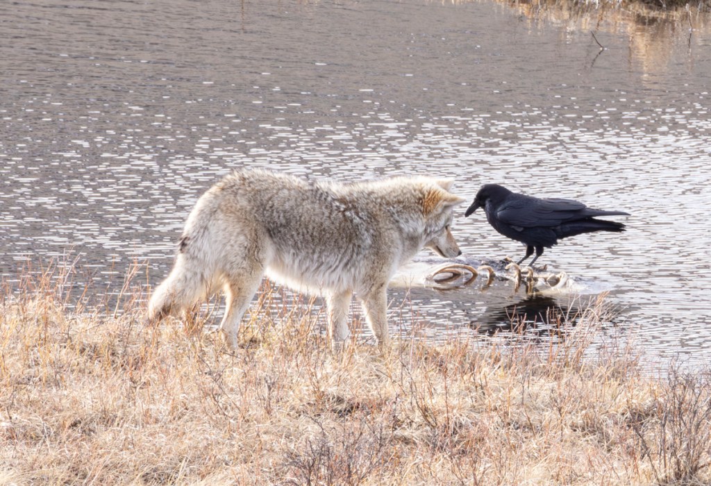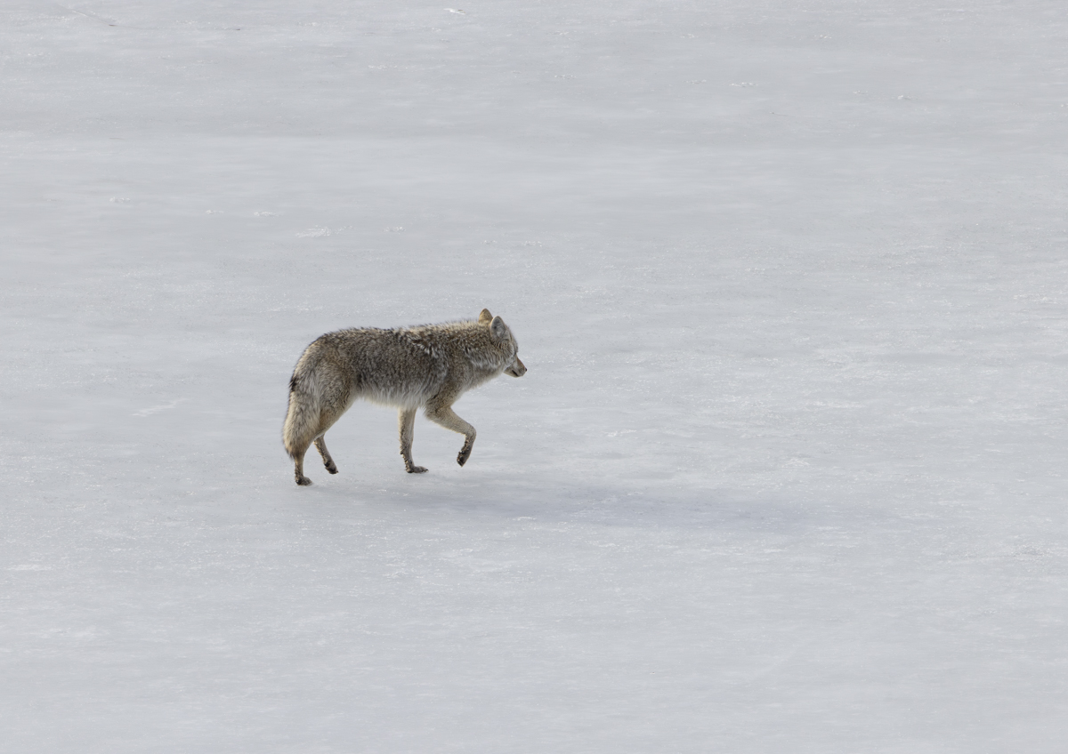 Another coyote soon showed up and followed in the path of the first, but came to the same conclusion that a bear was needed to make this food available. It seemed to sadly slink across the frozen lake and soon disappeared into the sage-covered hills.