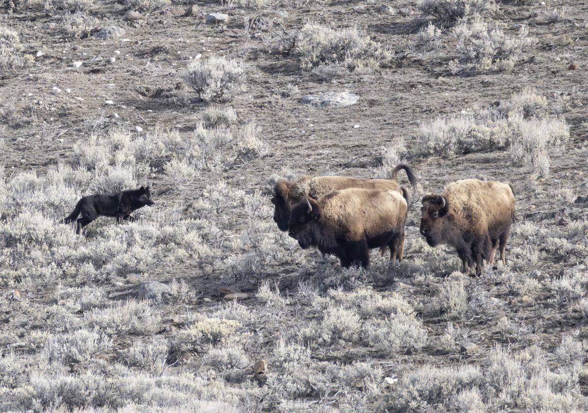 Along the way, the wolf passed by a small group of bison. They eyed the lone wolf, no doubt confident they could take this loner, but still had their tails arched as a sign of concern/anger that a lone predator would dare come so close.