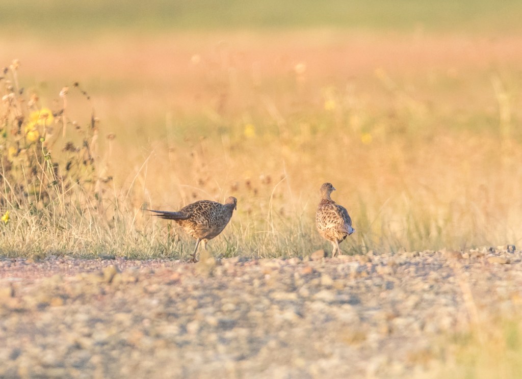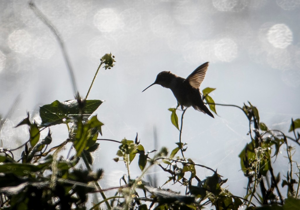 We were greeted with eagles, pelicans, and a variety of songbirds in that beautiful early morning light. A few other folks drove slowly along, telephoto lenses out the window, capturing natural moments. We spent a few minutes following a hummingbird (could not tell which species in that light) as it hovered at a variety of wildflowers along a canal edge. The back-lighting with shimmering dew drops in the distance made for a very artistic scene.