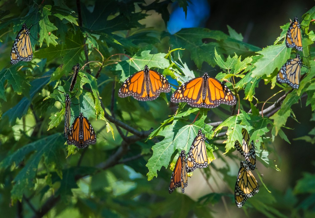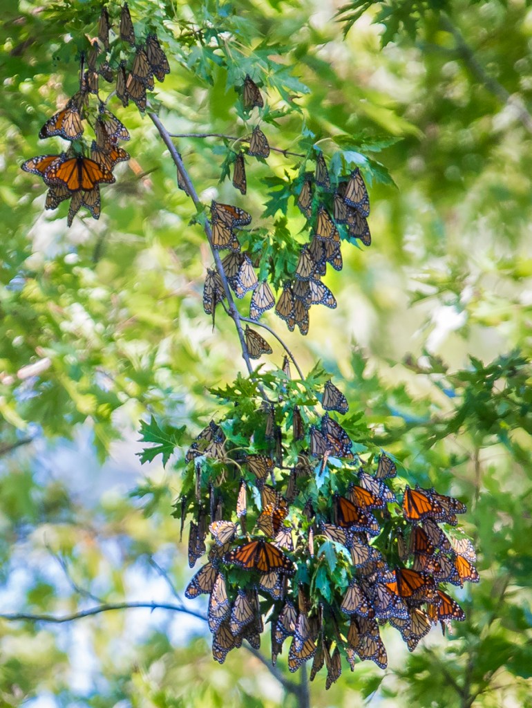 But our most magical moment came when we came up behind a stopped car in a tunnel of overhanging tree limbs. We slowed to see what the driver was photographing and then looked up to see some butterflies fluttering slowly across the road. Then we saw them — hundreds, actually thousands of Monarchs clustered on tree branches, with some starting to fly as they warmed in the morning sun. We got out and gaped in awe. It reminded me of my incredible trip to Mexico years ago to see the overwintering sites of millions of Monarchs. Though, obviously, not as numerous, this was still quite a display with more butterflies than I have seen anywhere else. We walked the road for awhile just taking it all in as the sun encouraged more and more butterflies to leave the roost and head for flowers in the wetlands and meadows through the trees. We both agreed that this spectacle rivaled our moonlit night with the elk herd in terms of memories that will last a lifetime.