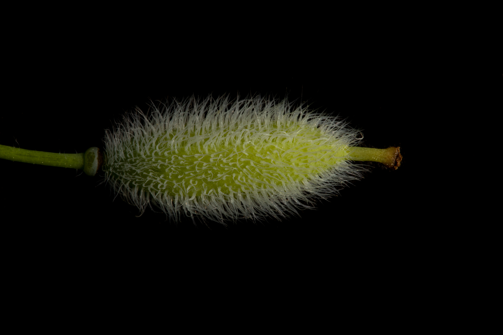 Wood poppy ovary that has begun to swell as it ripens. Notice the stigma and style still visible to the right side of the image.
