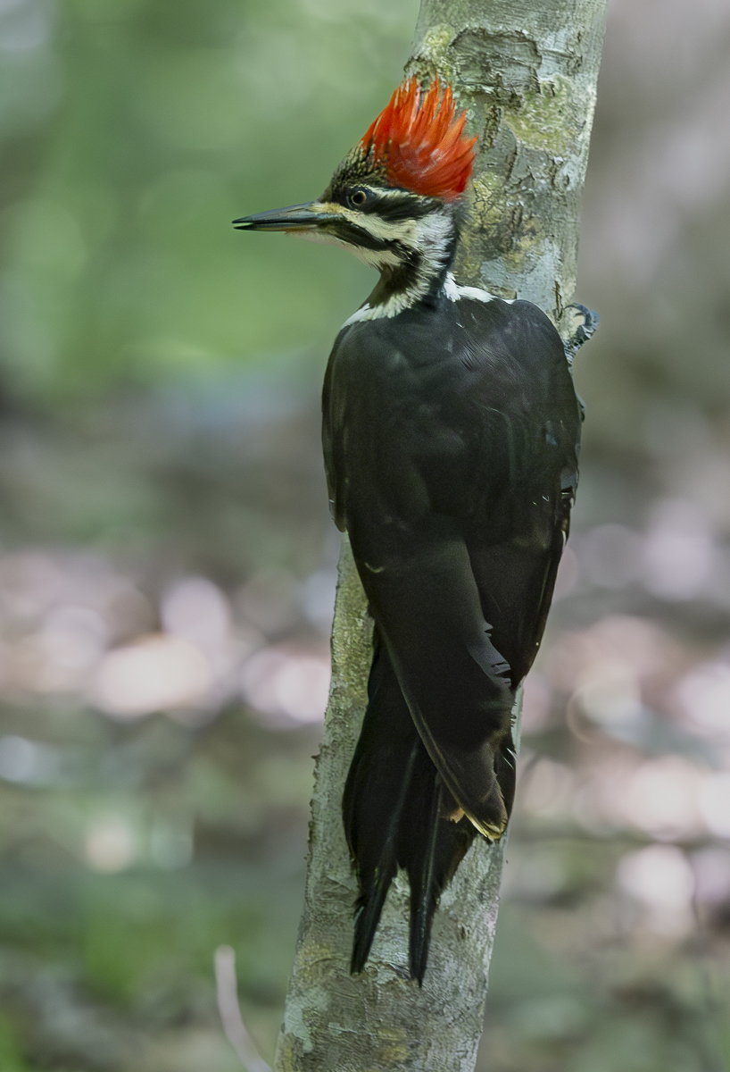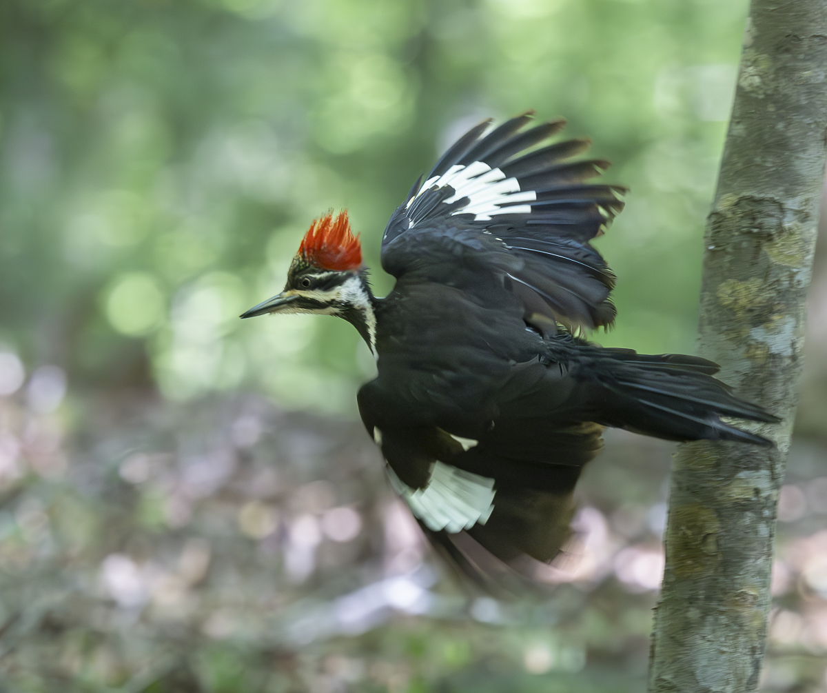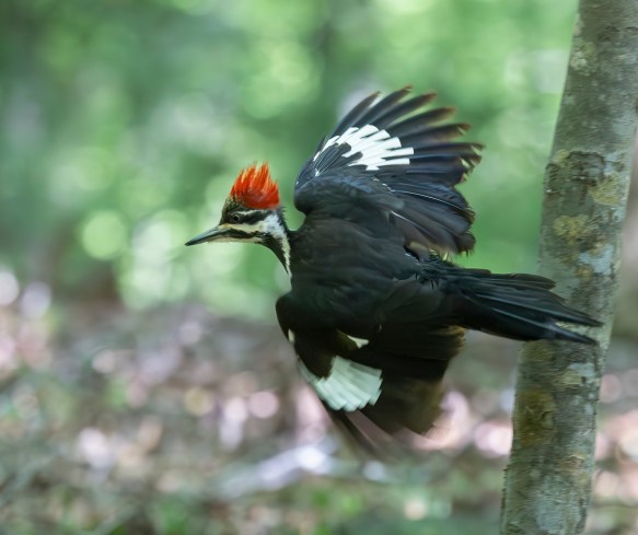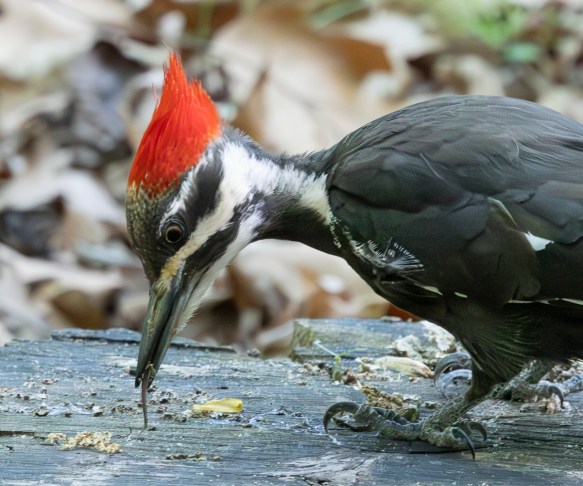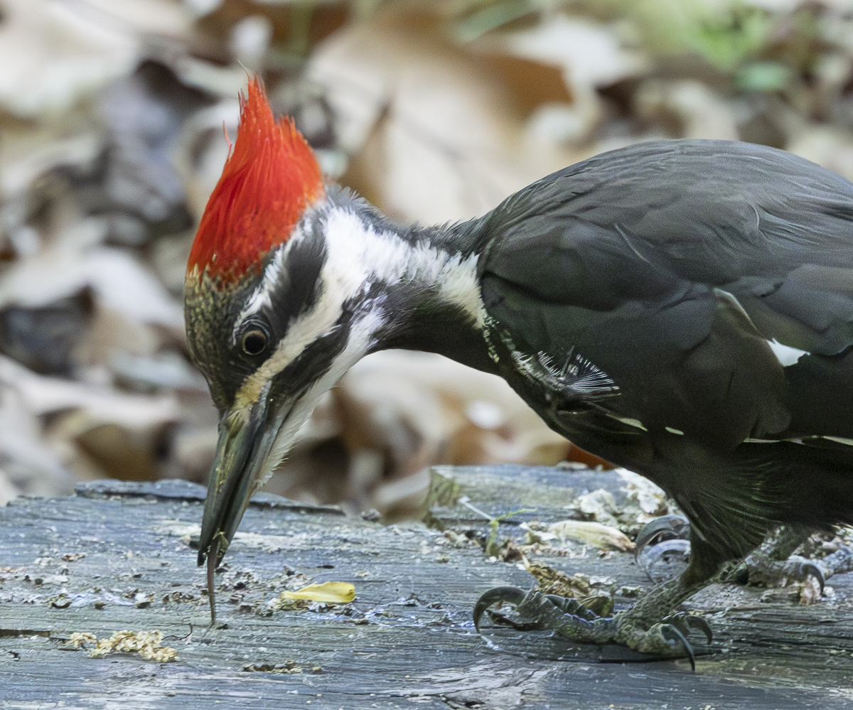This female pileated woodpecker spent several minutes with us on our last walkShe takes off to another piece of wood on the ground to search for food