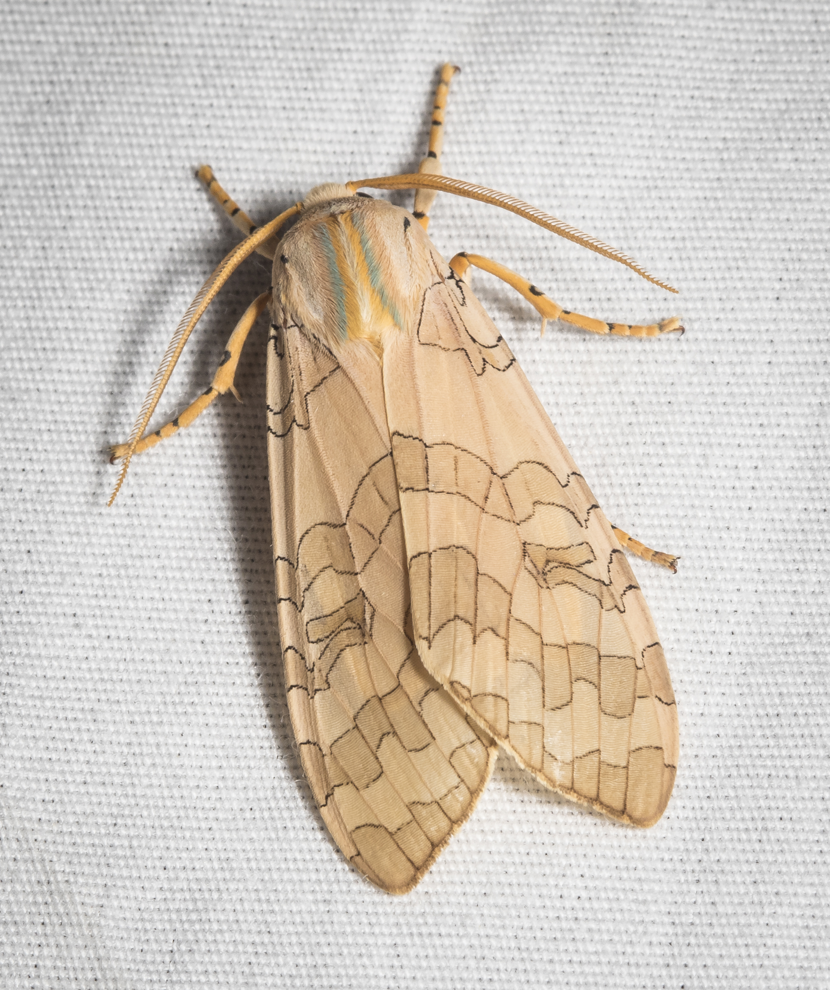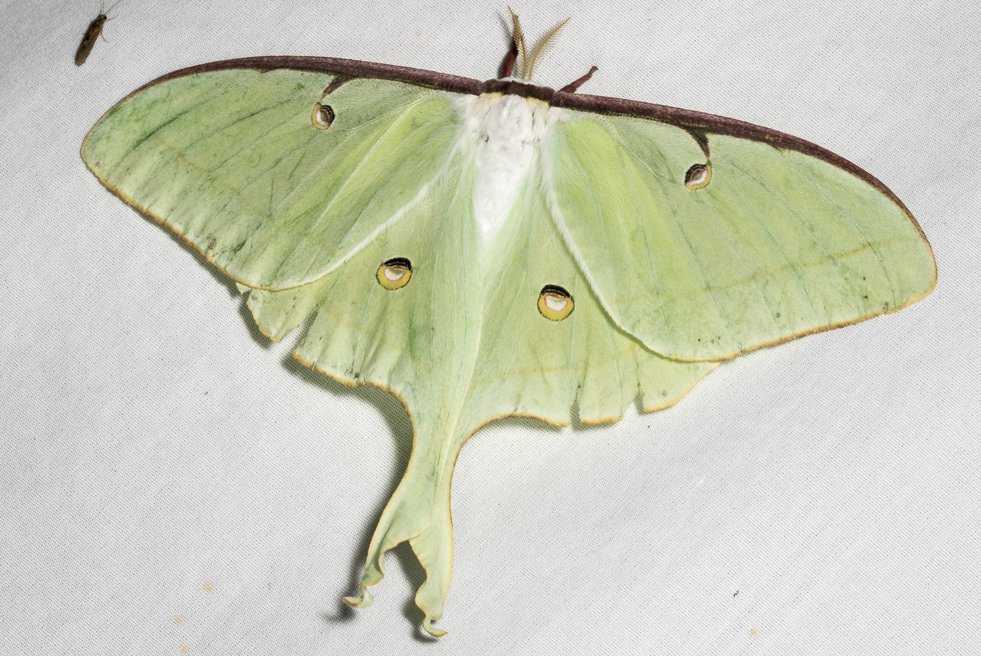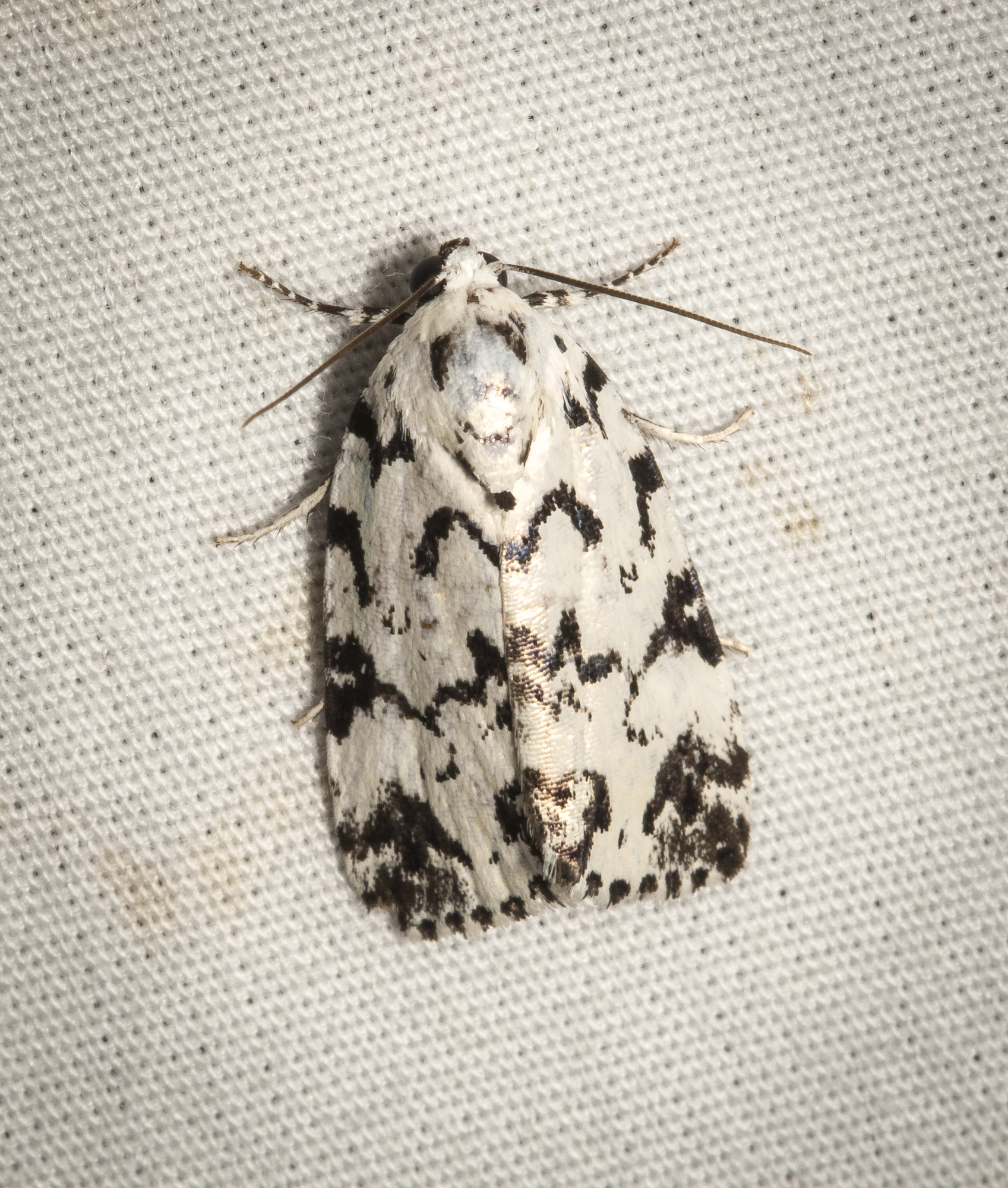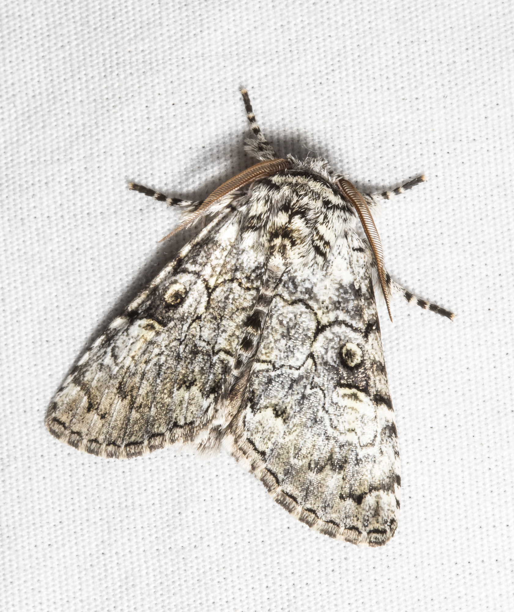 I love the pattern and colors of this moth. It is either a Banded Tussock or a Sycamore Tussock Moth (Halysidota tesselaris/harrisii). They are apparently very difficult to tell apart, and both caterpillar species are common here.One of the more common species at the sheet was the beautiful Rosy Maple Moth, Dryocampa rubicunda.Always happy to see a Luna Moth, Actias luna.There are other green guys out there – like this Angle-winged Emerald, Chloropteryx tepperaria.Red-spotted Emerald, Nemoria saturiba.Drab Prominent, Misogada unicolor.Something appears to be wrong with the wings of this Mottled Prominent, Macrurocampa marthesia.White-blotched Heterocampa, Heterocampa umbrata.Love the shoulder pattern on this Oval-based Prominent, Peridea basitriens.Moth common names are fascinating, like this one – The Laugher, Charadra deridens.The Hebrew, Polygrammate hebraeicum, so-named because the black markings somewhat resemble Hebrew script.False Underwing, Allotria elonympha.