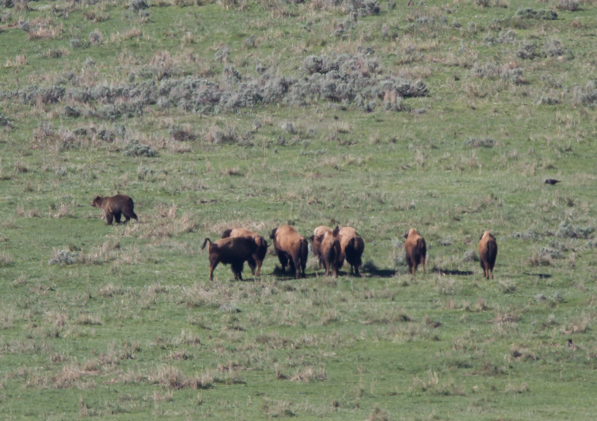On the group’s last morning, we witnessed some amazing interactions at that same carcass. When we first arrived there were two wolves just leaving the carcass, and they were being herded by a group of several Bison that seemed none too pleased that these predators were dining on one of their own. The Bison eventually pushed the wolves away and convinced them today was not a good day to continue feeding. Meanwhile, a Grizzly came down out of the woods and eventually claimed the carcass, in spite of being initially held off by the same agitated Bison. Quite a Lamar farewell for my group – a Grizzly Bear, two Gray Wolves, and a protective herd of Bison interacting in the same field of view of our binoculars.