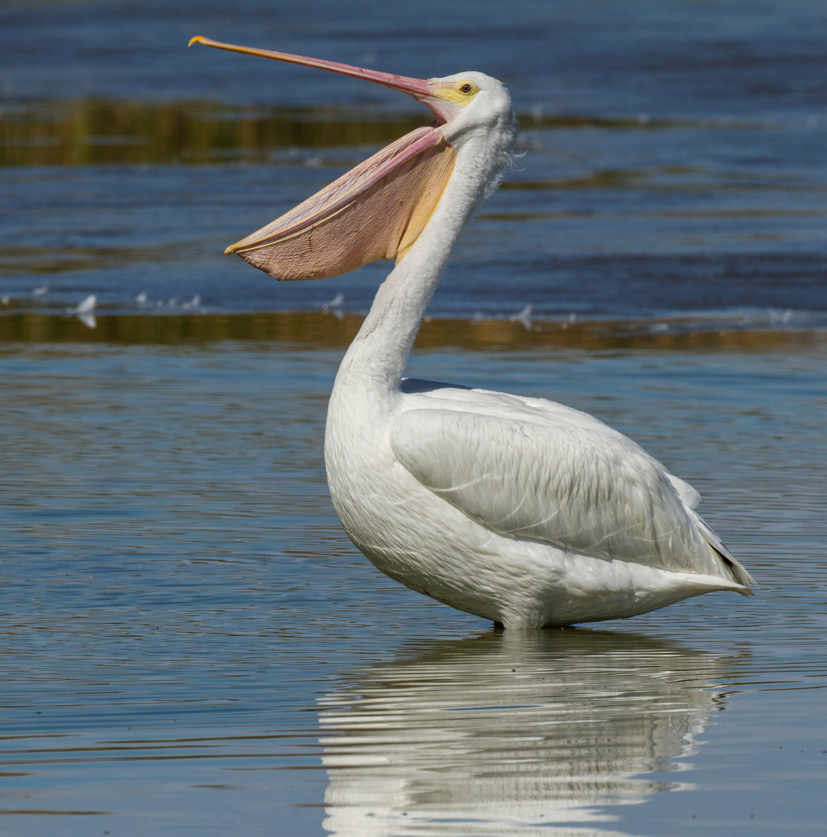 American White Pelican feeding in shallow waterA pelican pulling its beak back before squeezing out the excess water and gulping any captured fish