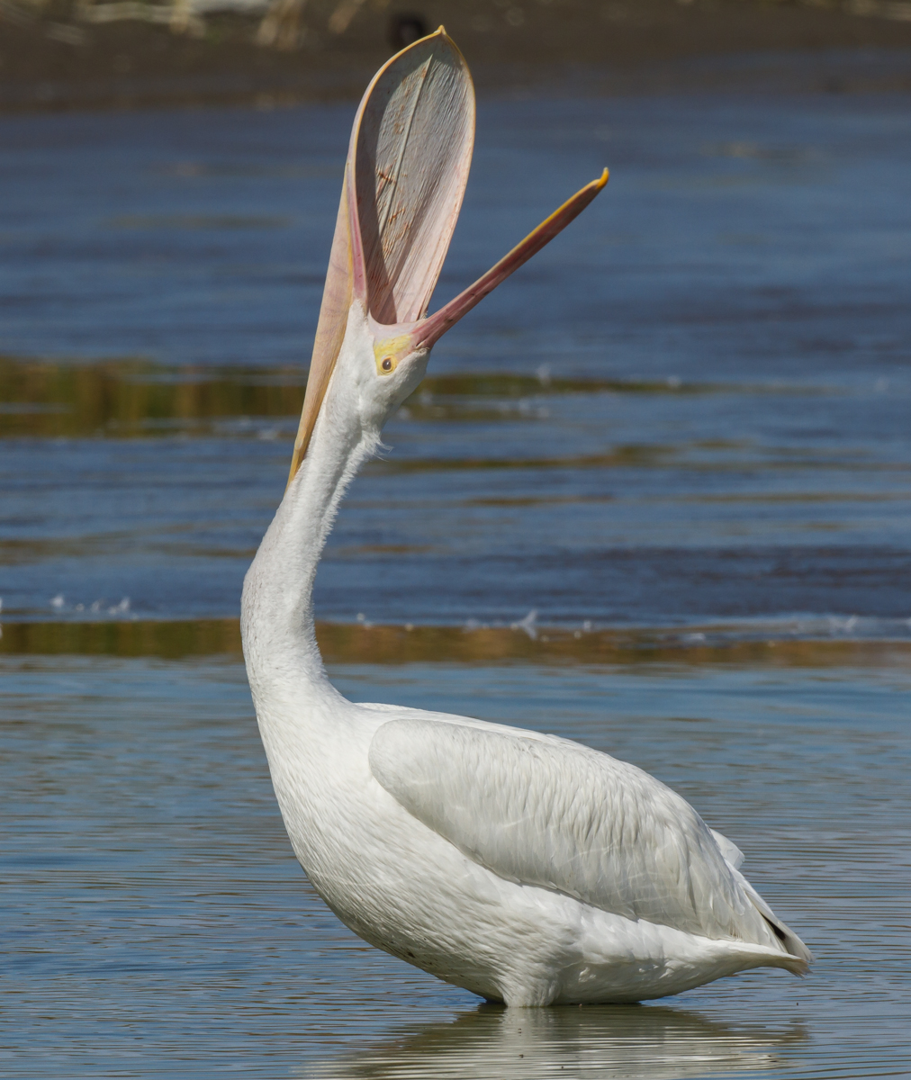 But the most amazing thing I saw these pelicans do with their pouch was what can only be described as pelican pouch yoga – a series of bizarre stretches and gapes. I saw several do this maneuver, one that they can do quickly, so I was only able to capture the sequence on one bird. They start by stretching the pouch over their breast, then stand up and point skyward and snap their bill while having the pouch wide open. Very strange indeed.