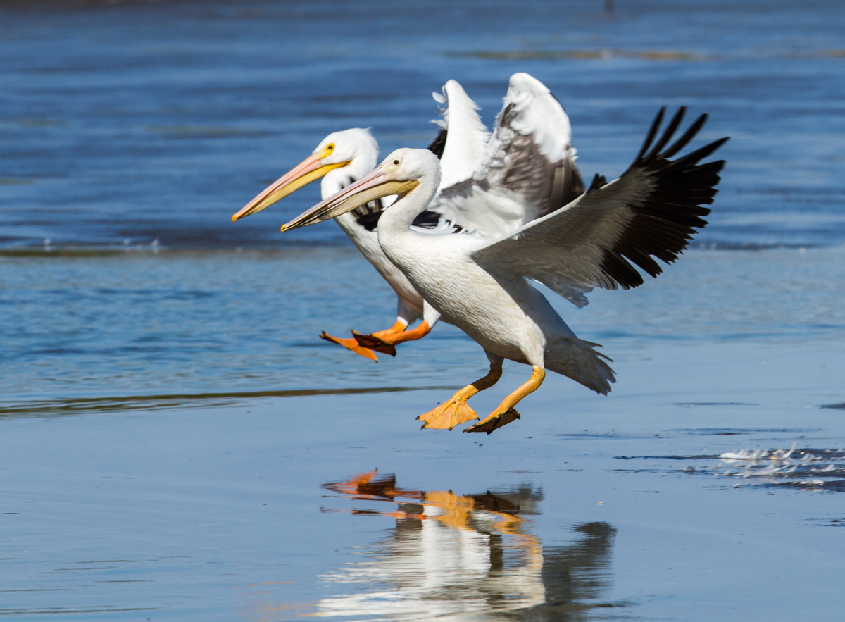 Landing approach with feet downTouch down and skid to a stopA pair of pelicans as they land