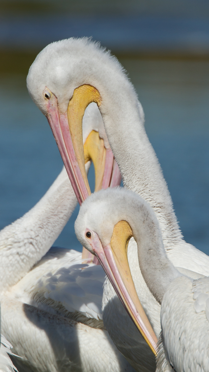 Preening under the wingTwisting and turning to preenA trio of preening pelicans