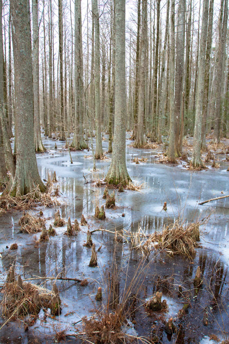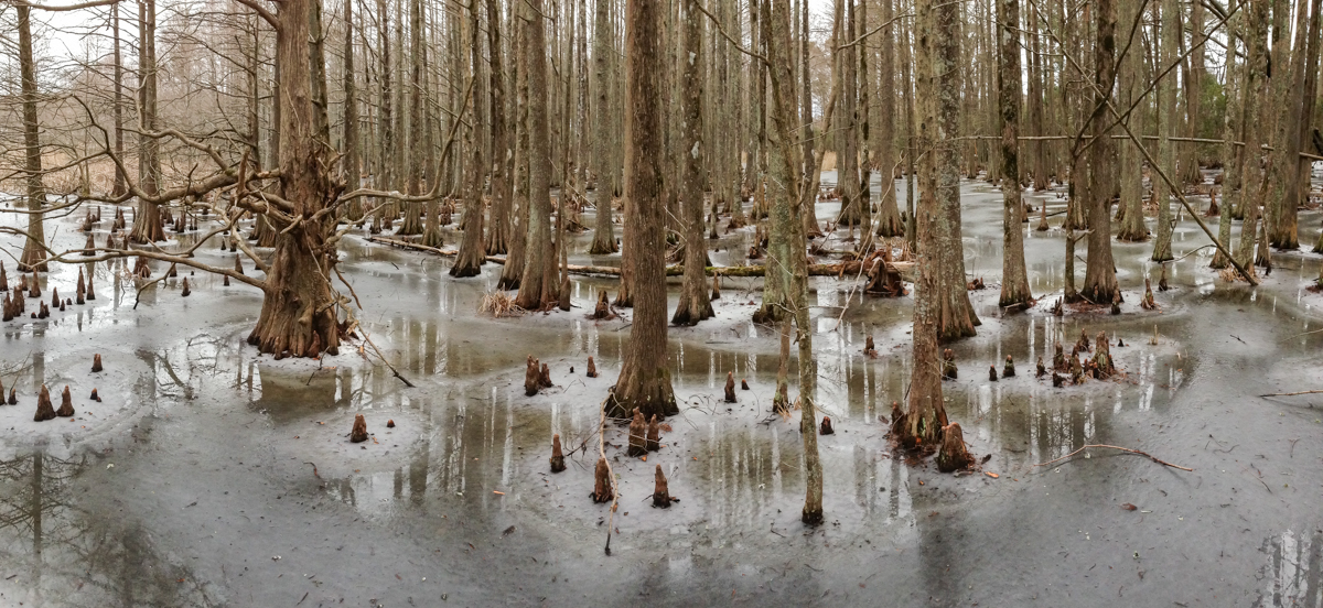 Panorama of frozen swampIce and reflections in cypress swampBald Cypress knees in the deep freeze along the boardwalkPatterns in ice create circles around each tree trunkBlue-gray cast to ice in swamp