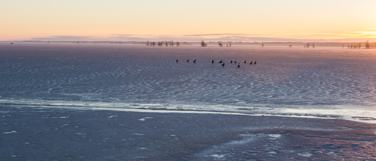 I had another trip to North Carolina’s winter wonderland this past weekend. And a wonderland it was…Lake Mattamuskeet was largely frozen, a most unusual sight. The last time this happened was 1986, and, ironically, I was there that winter as well. I met my group on the causeway at sunrise and we marveled at the expanse of grayness before us. A few cold Canada Geese walked on the ice, probably wondering what had happened to their once watery haven.