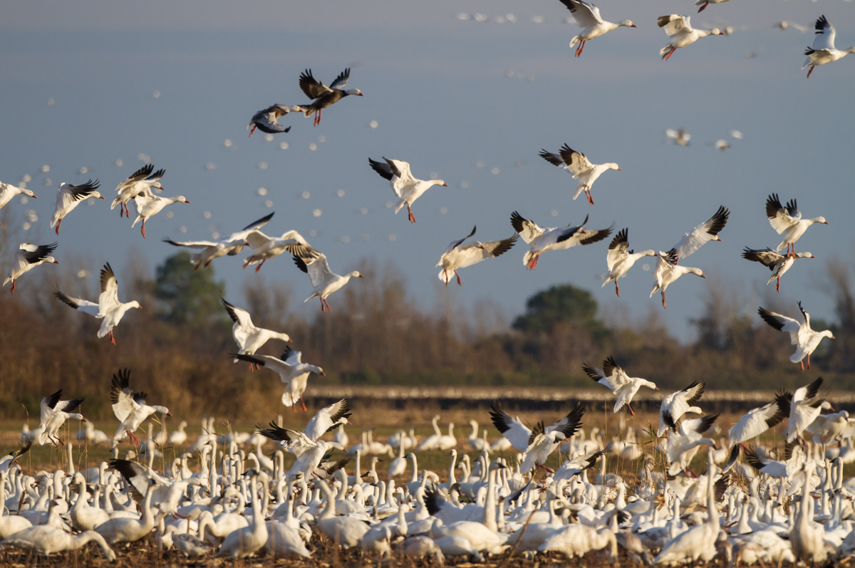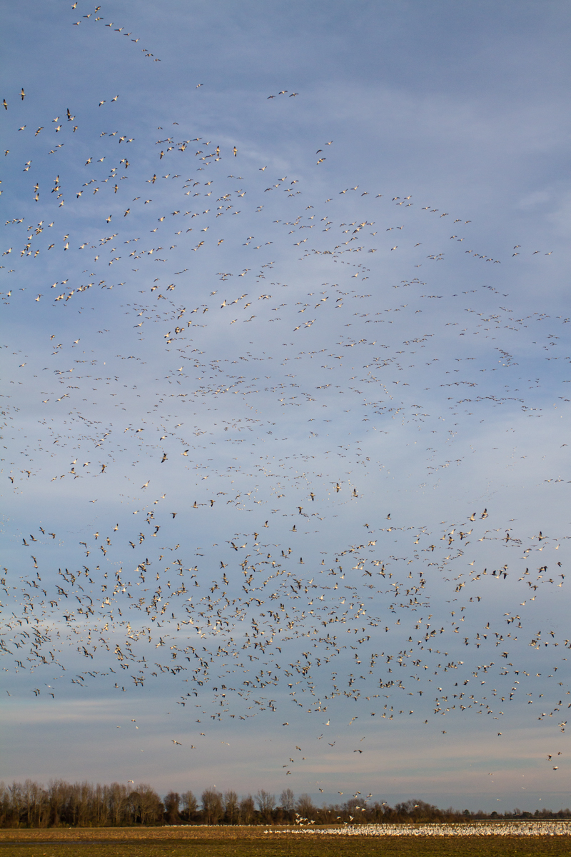The light continued to get better, turning the geese into golden-winged fliers at times, then bright white ones as they banked. The sky in front of us was soon swirling with thousands of geese noisily making their approach.