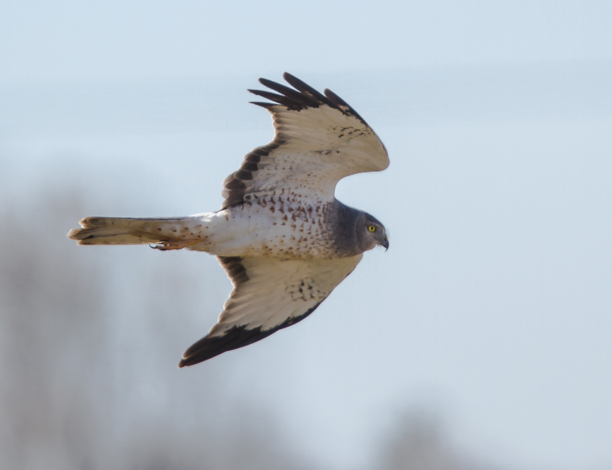One advantage of a steady breeze is that it slows down the flight speed of many birds (at least those heading into the wind) and gives you a chance to watch and photograph them. Such was the case with a ghostly male Northern Harrier battling the stiff wind as he hunted the roadside ditches. If only another car had not come along, we might have stayed with this soaring hunter and grabbed some memorable images.