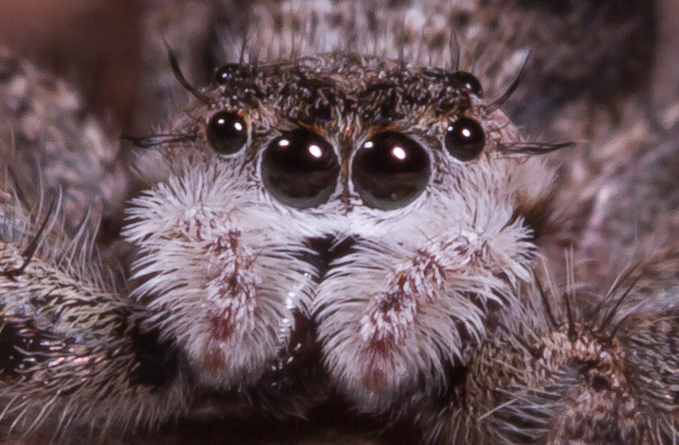 A close look at this female shows the characteristic large pair of eyes in front and the dark single lashes above each of the other eyes. A male will have a reddish-orange stripe under the row of front eyes.