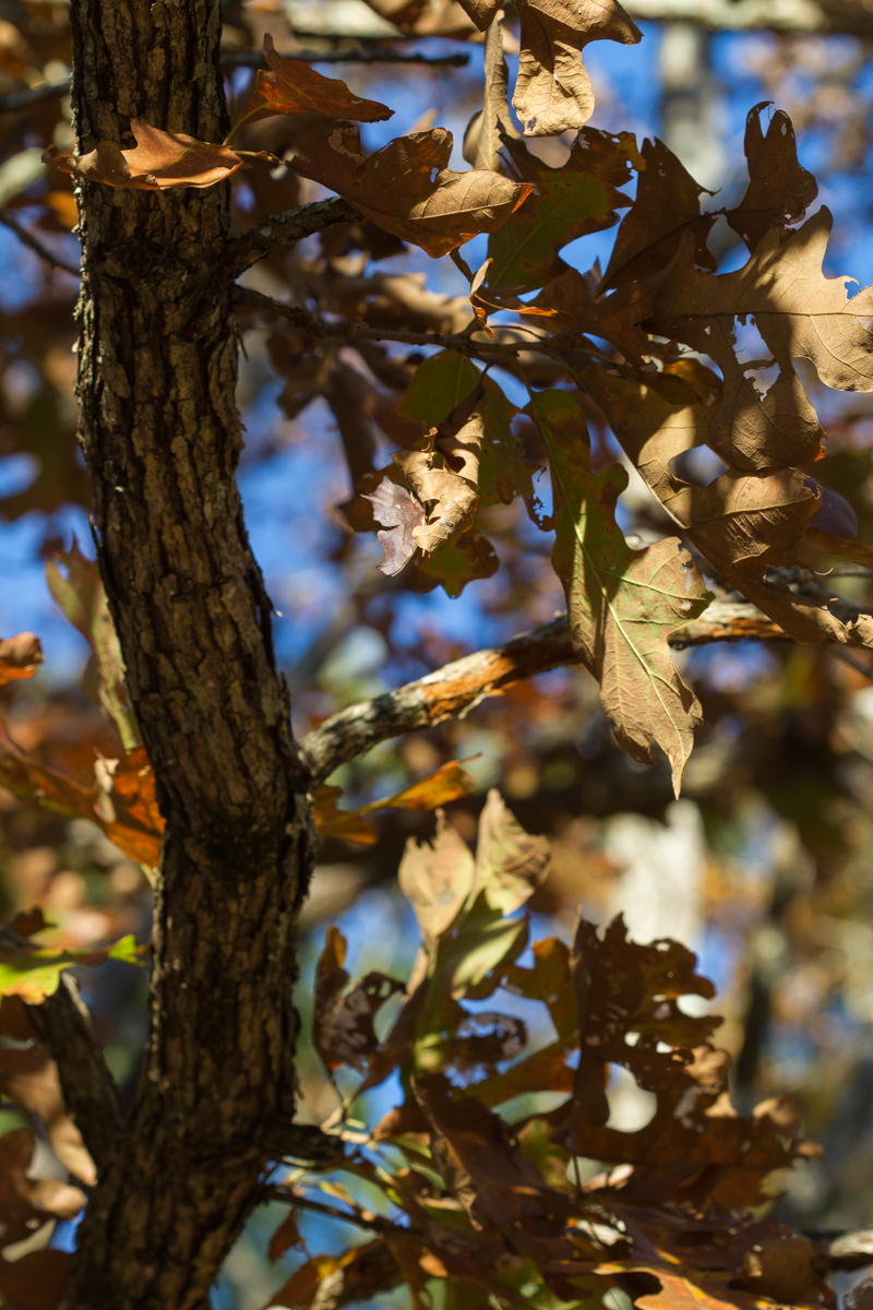 You see it, don’t you? Look closely:) Okay, if you did see it, you are good, because it resembles one of the brown leaves on the oak branch. I circled the object of interest in the image below.