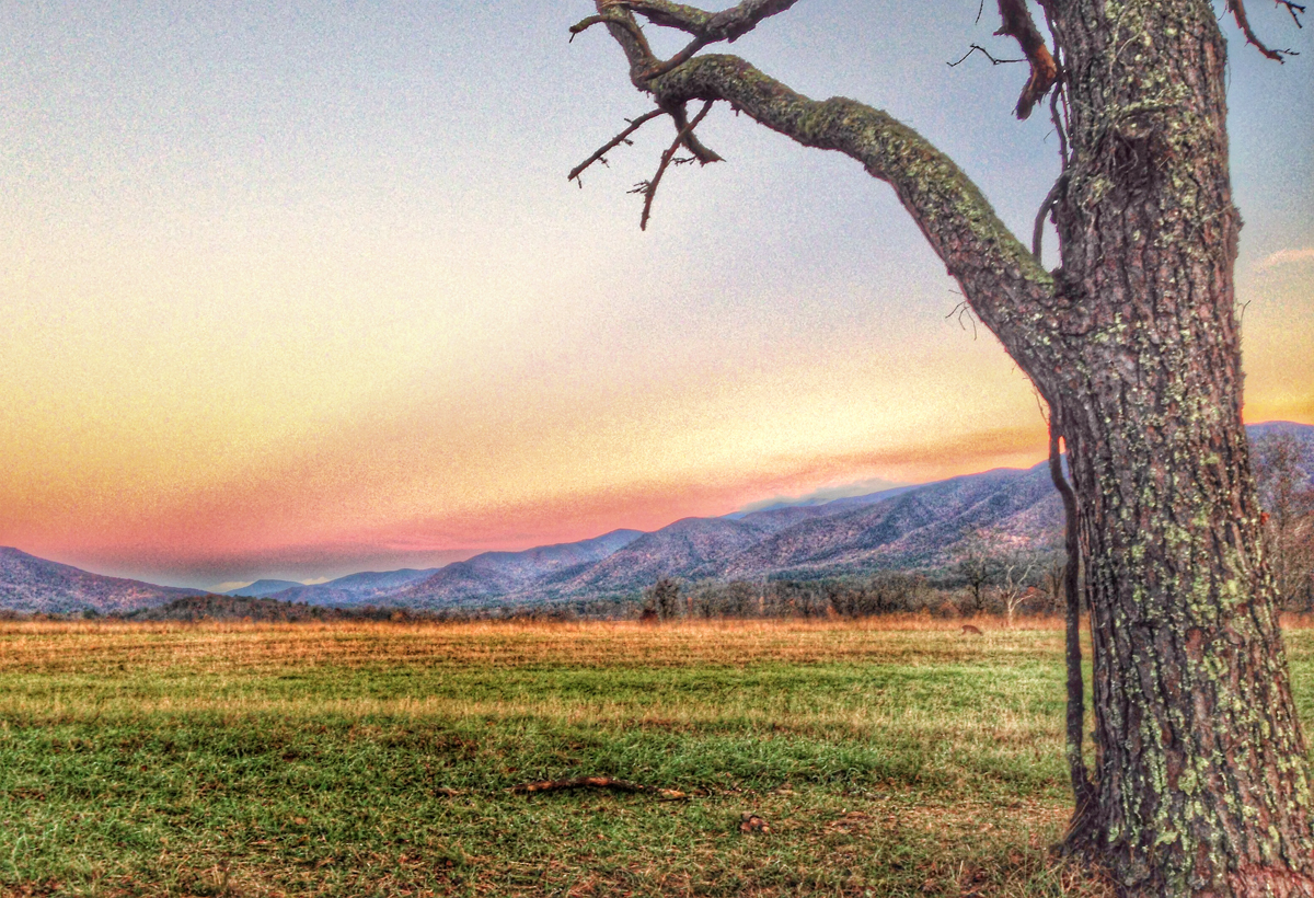 I finally drove the remainder of the loop road as the sun was setting and looked for places to check the next morning. As I photographed a particularly beautiful tree out in one of the meadows, I heard coyotes yipping a few hundred yards away under the clear, darkening sky. A great ending to my first afternoon in Cades Cove. I awoke about 4 a.m. and headed out into the cold air toward the bathroom when I heard some rustling in the leaves about 20 feet from the tent. In the moonlight, I could see a dark form and my first thought was bear (there are warnings about bear-proofing your campsite). But when I turned on my flashlight it was a Wild Boar, an introduced species that the park is actively trying to control. They grub through the soil looking for whatever they can find to eat and, in doing so, root up large amounts of plants which can damage sensitive habitats. It looks like a small bulldozer has gone through an area after they are finished feeding. The Boar trotted off and I gladly moved off in the other direction.