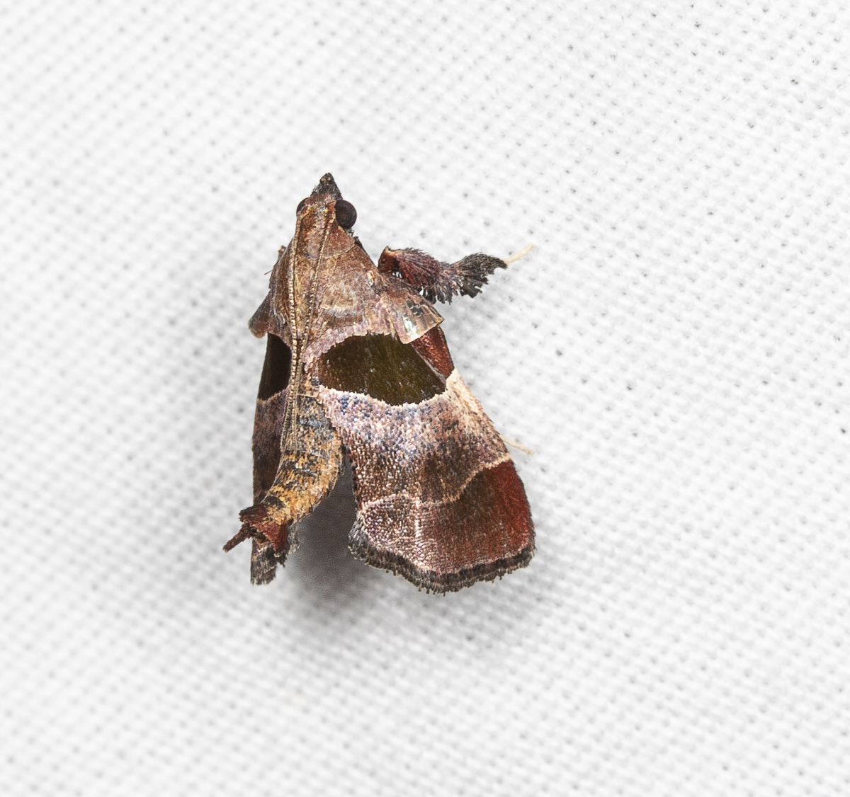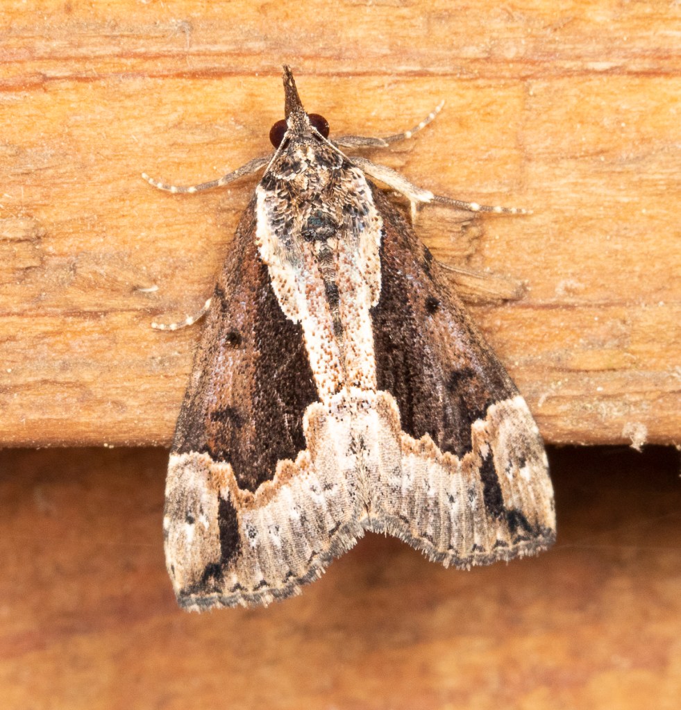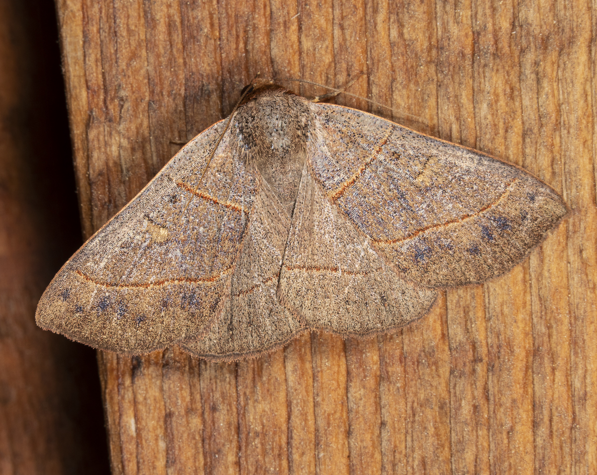 -Brown Panopda Moth – distinctive accent in this outfit (one reference described the dark wing marks as looking like a body-less person sitting in a chair). Larvae usually on hickory.