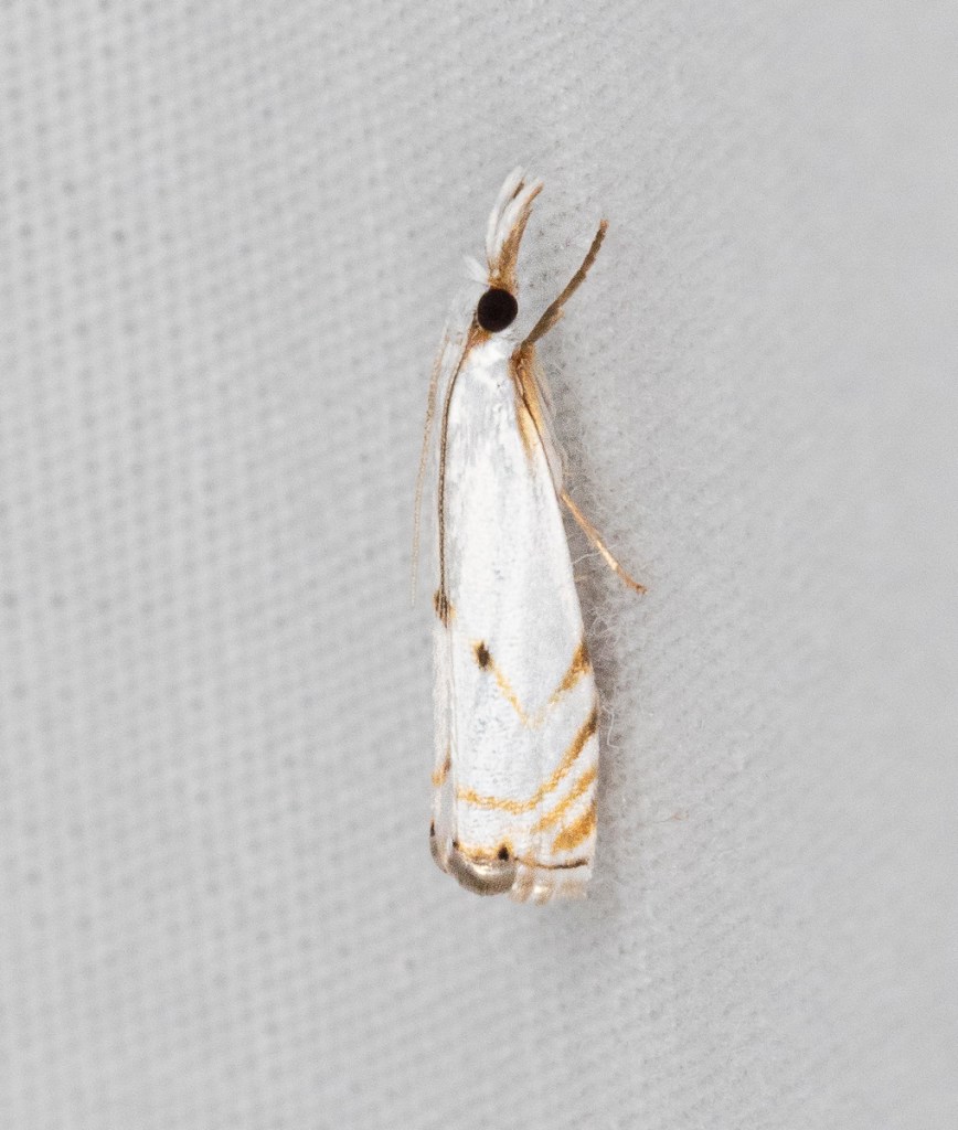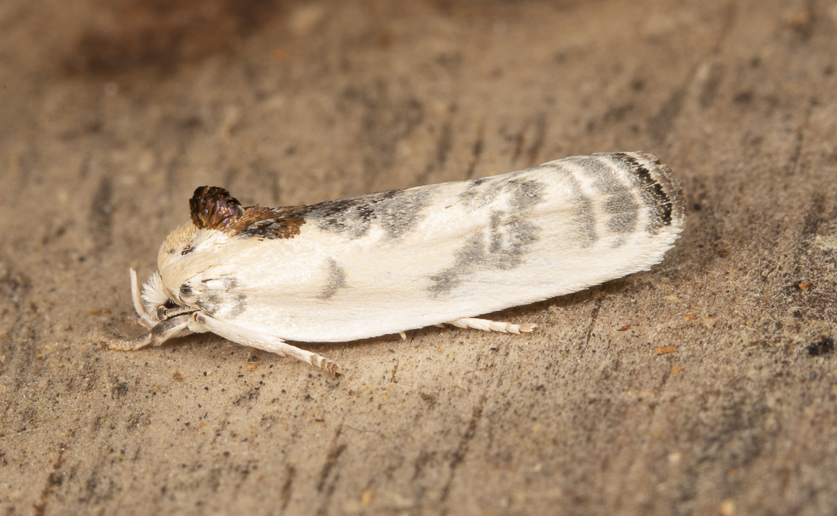 -White Furcula Moth – a nice salt and pepper look with a hint of metallic blue and orange. Larvae often found on cherry.