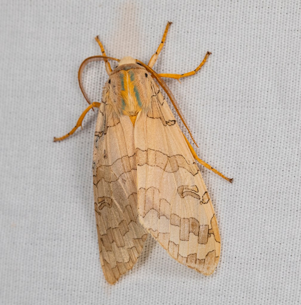 -Orange-tufted Oneida Moth – described s having a “woodsy color scheme”. Larvae feed on oaks and oak galls apparently.