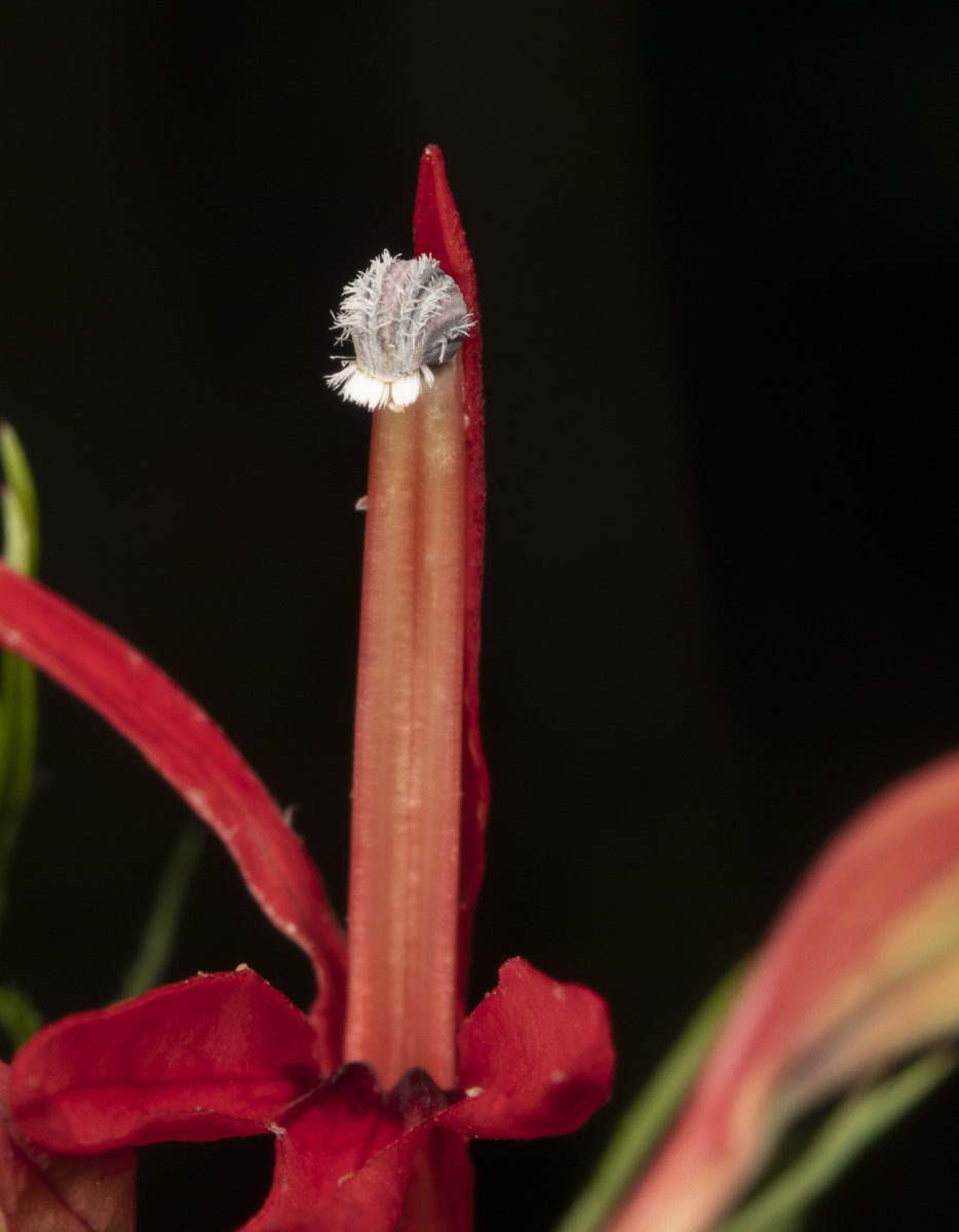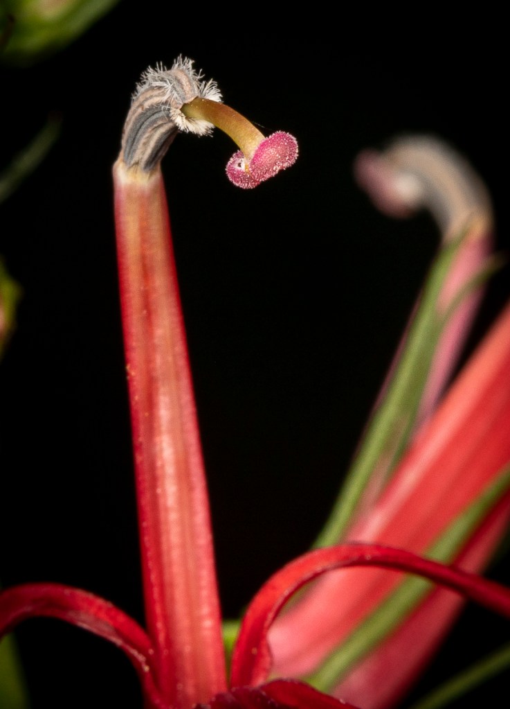 -As the flower matures, the style pushes the now receptive stigma out the top of the tube. When a hummingbird sticks its beak into the flower to get the nectar, pollen grains on its head can be transferred to the stigma.