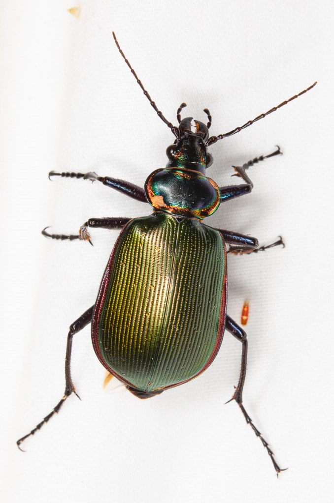 -Fiery Searcher – This large (1.25 inches) beetle is an active hunter. In fact, it is a member of the caterpillar hunter group of ground beetles. It can give you a powerful bite, so look, but don’t touch. The metallic colors can be stunning.