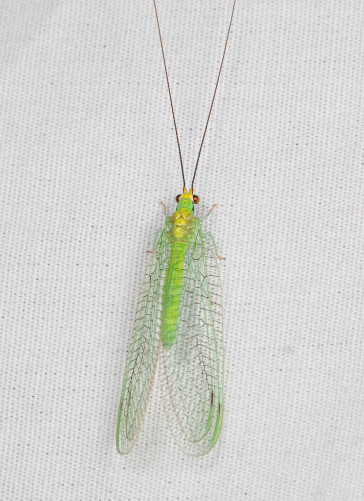 -Green Lacewing – a delicate-looking lacy-winged insect with a fluttery flight. Larvae are voracious predators of aphids and often camouflage their backs with lichens or the dead bodies of their prey. Zoom in and check out those golden orb eyes.