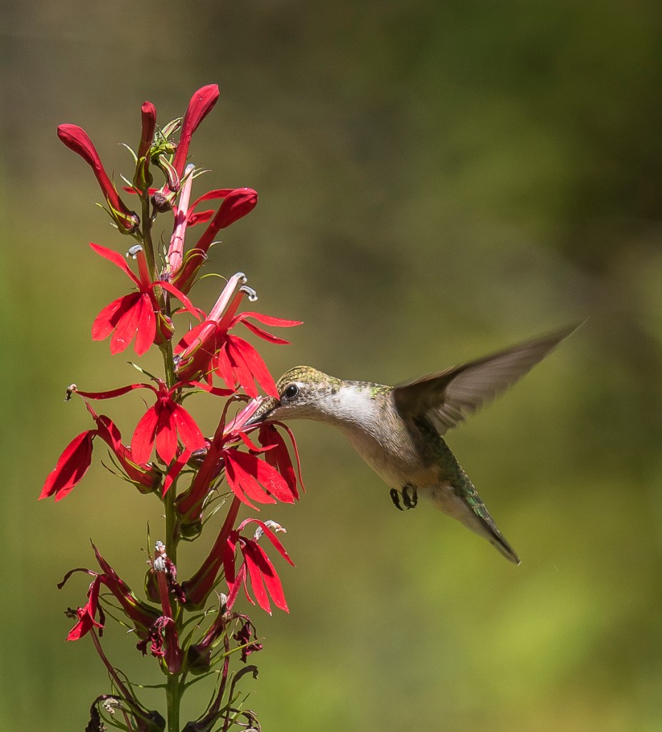 Here in our home in the woods, I can look out our windows and see all sorts of interconnections – butterflies on Ironweed and Joe-Pye-Weed, American Goldfinches eating coneflower seeds, and birds searching for insects in the trees. There is another connection that seems to be one of the purest- like two puzzle pieces that fit perfectly together. That is the link between one of my favorite native wildflowers and one of my favorite summer birds – Cardinal Flowers and Ruby-throated Hummingbirds. If you look at their range maps, they overlap to a great degree, owing, no doubt, to the dependence of the flower on the pollination compatibility of these hummingbirds.