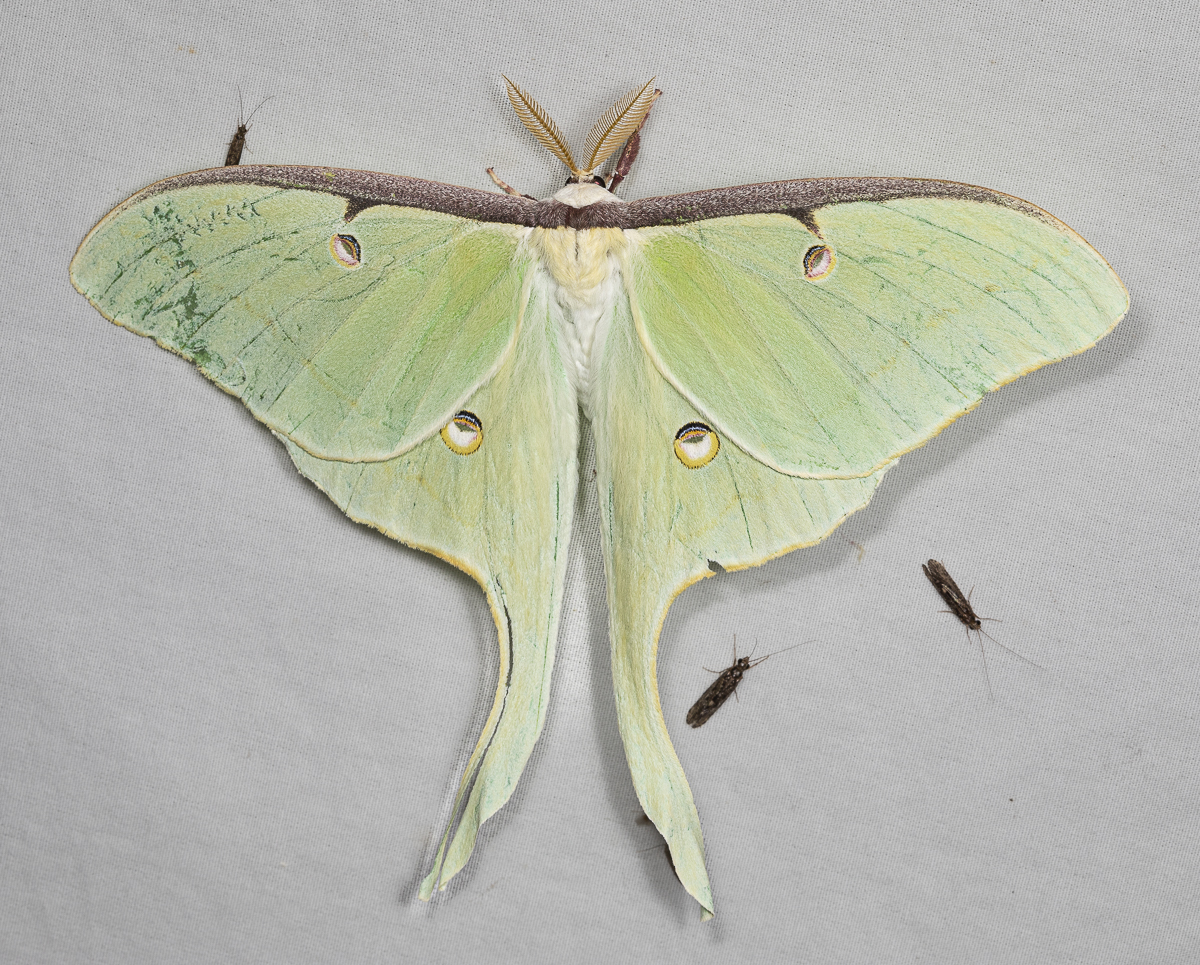 -Luna Moth – each time we have put out the moth lights, the large silk moths like this Luna and several Imperials (photographed in an earlier post) usually appear late (after midnight). It is worth the wait.